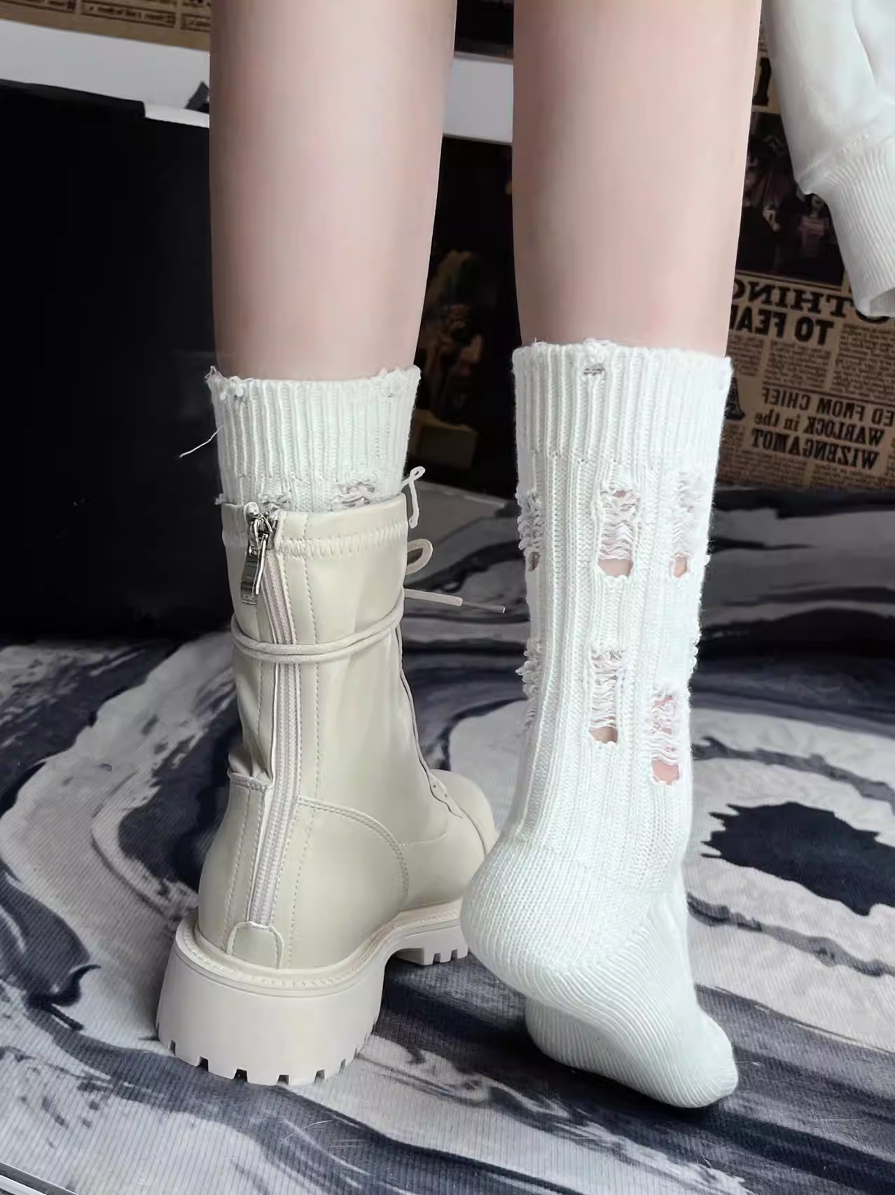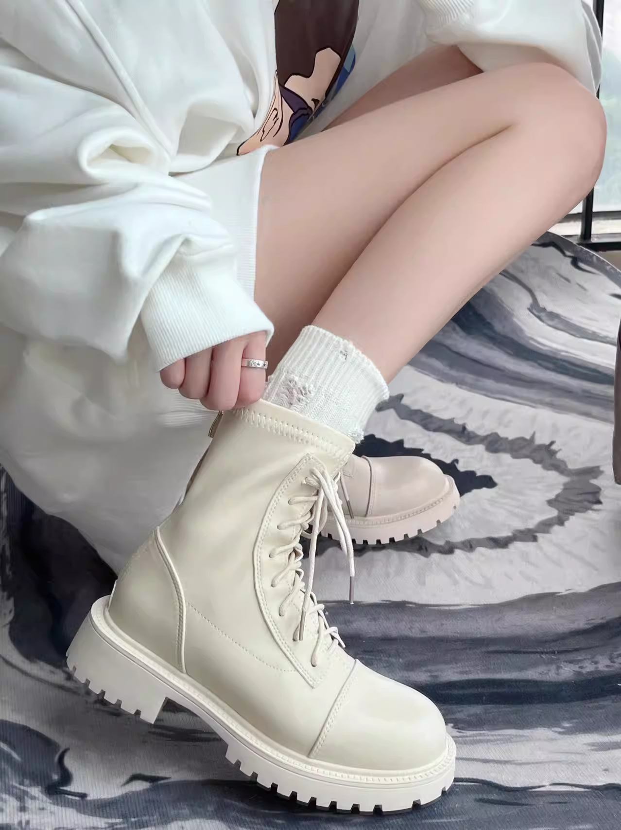 - Giày bốt Martin da bò màu trắng dành cho nữ, mẫu thu đông 2025, kiểu buộc dây, chất liệu thun ôm sát, phong cách Anh, đế dày, kiểu ngắn