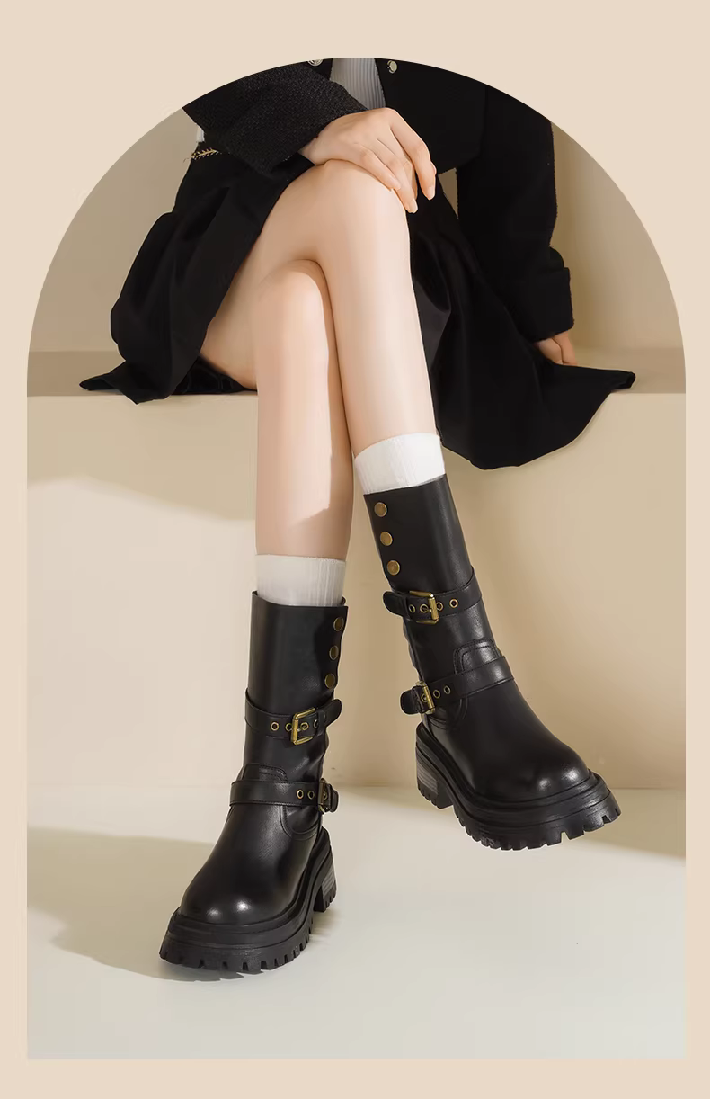 - Giày bốt Martin đế dày Daphne dành cho nữ 2025 Giày bốt lót lông mùa đông mới Giày bốt hiệp sĩ Giày bốt ngắn màu nâu Melard dành cho nữ