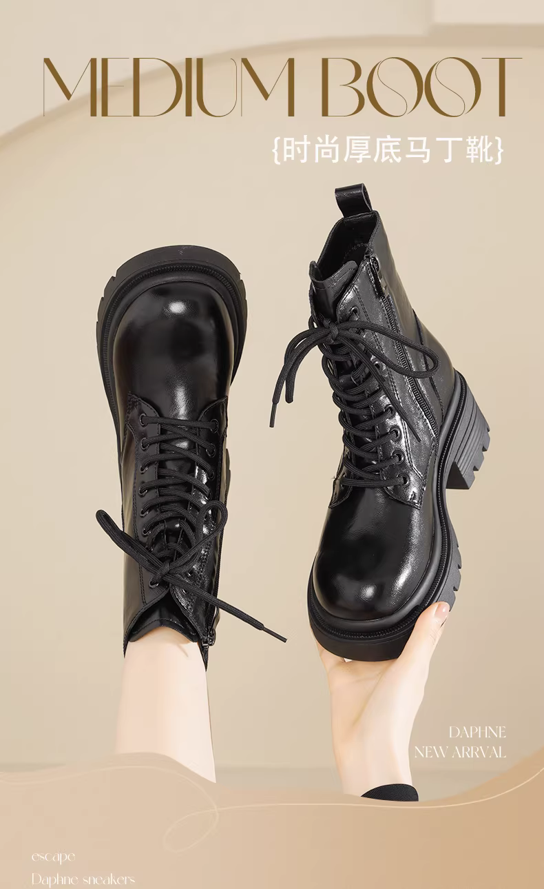 Giày bốt Martin đế dày Daphne dành cho nữ 2025 kiểu Anh mới mùa đông, bốt ngắn tăng chiều cao, kiểu dáng thon gọn, màu đen.