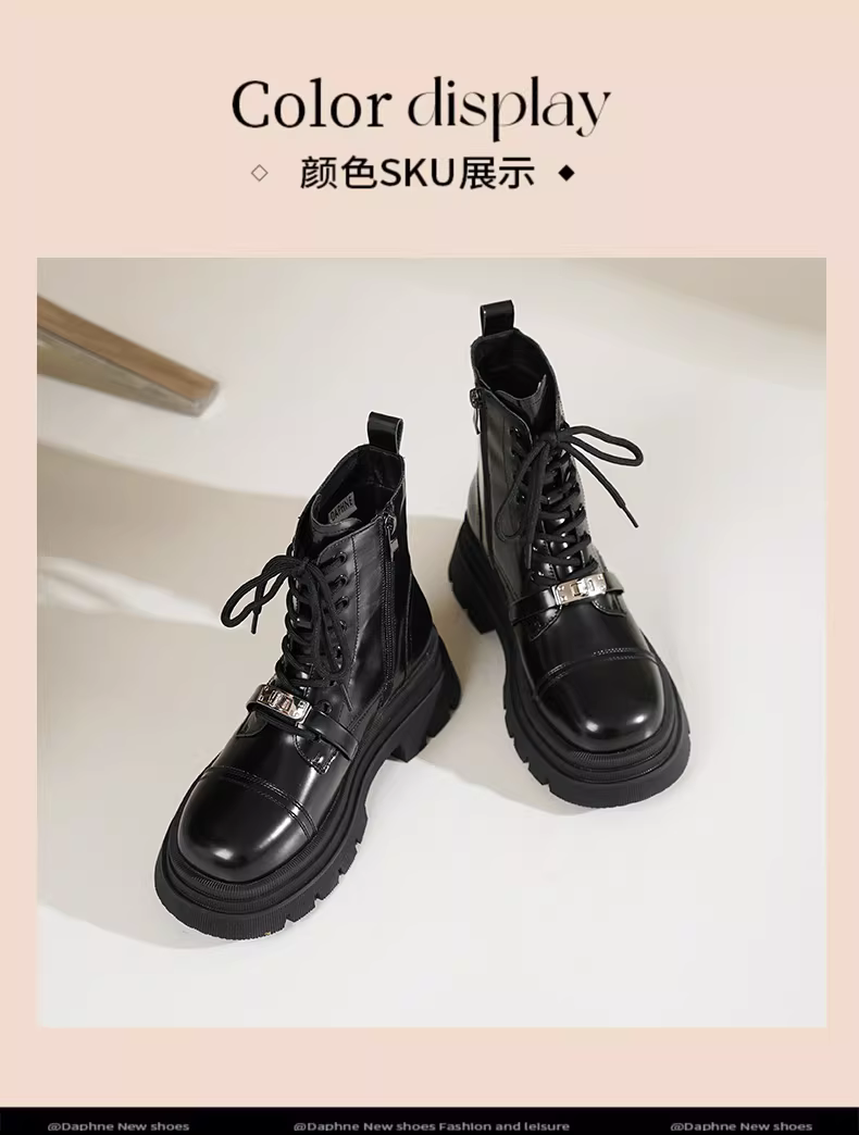 - Giày bốt Martin đế dày Daphne dành cho nữ 2025, mẫu mới xuân thu, tăng chiều cao, kiểu dáng thon gọn, màu đen, buộc dây, có khóa, kiểu ngắn