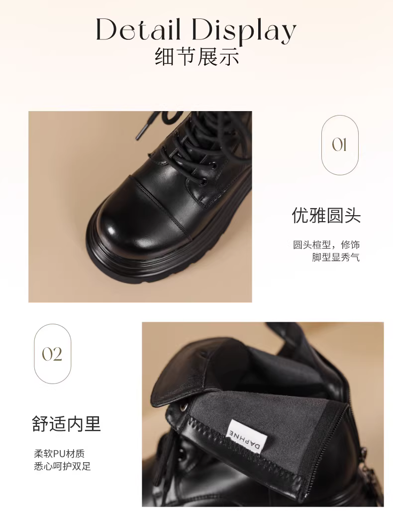 - Giày bốt Martin đế dày Daphne dành cho nữ, phong cách Anh, mùa thu đông 2025, kiểu dáng đơn giản, gót dày phổ biến, khóa kéo phía sau, bốt ngắn màu đen.