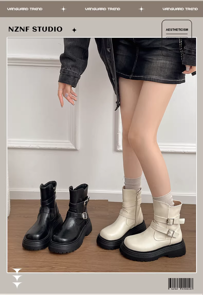 Giày bốt Martin đế dày kiểu Anh màu trắng dành cho nữ, mẫu thu đông 2025 mới, tăng chiều cao, thon gọn, kiểu cổ điển.