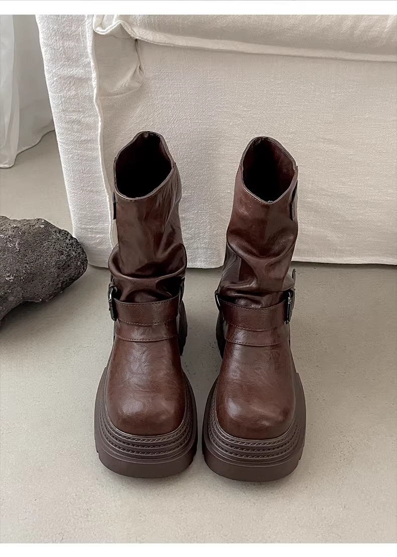 - Giày bốt Martin đế dày tăng chiều cao kiểu Anh đen dành cho phụ nữ nhỏ nhắn, mẫu mới thu đông 2025, kiểu cổ điển.