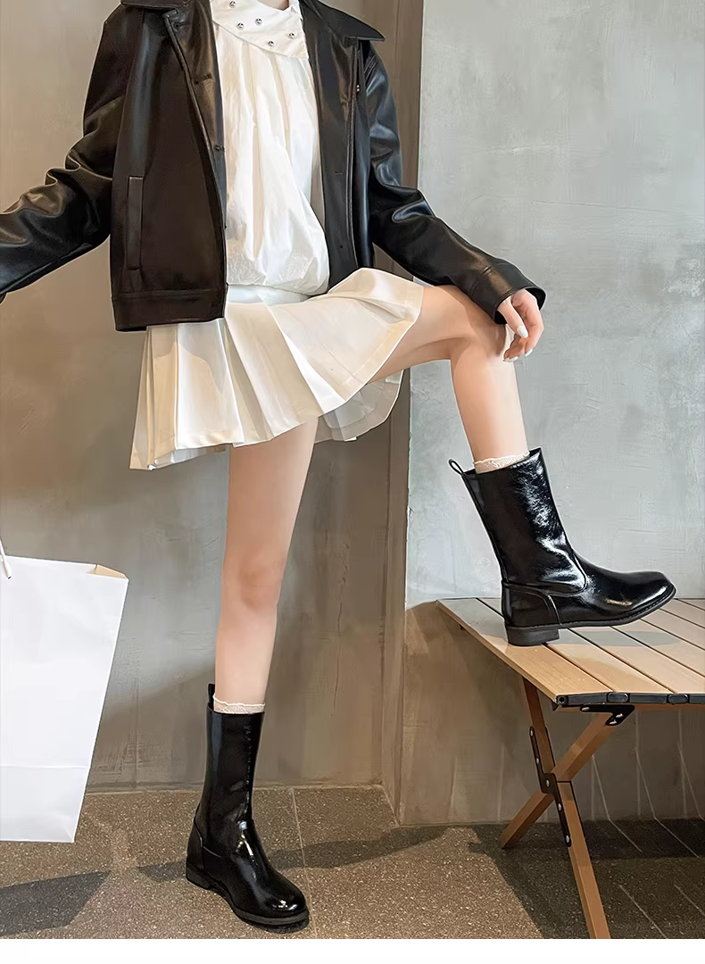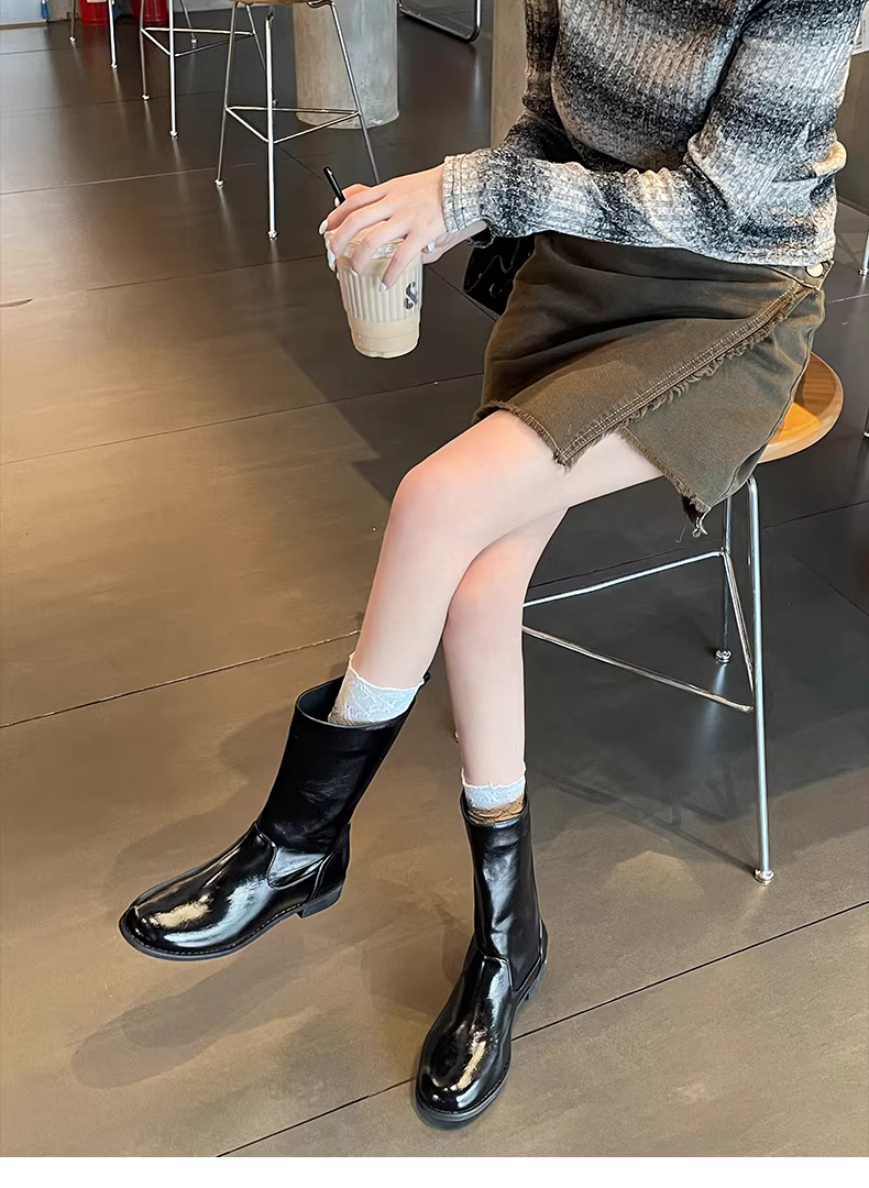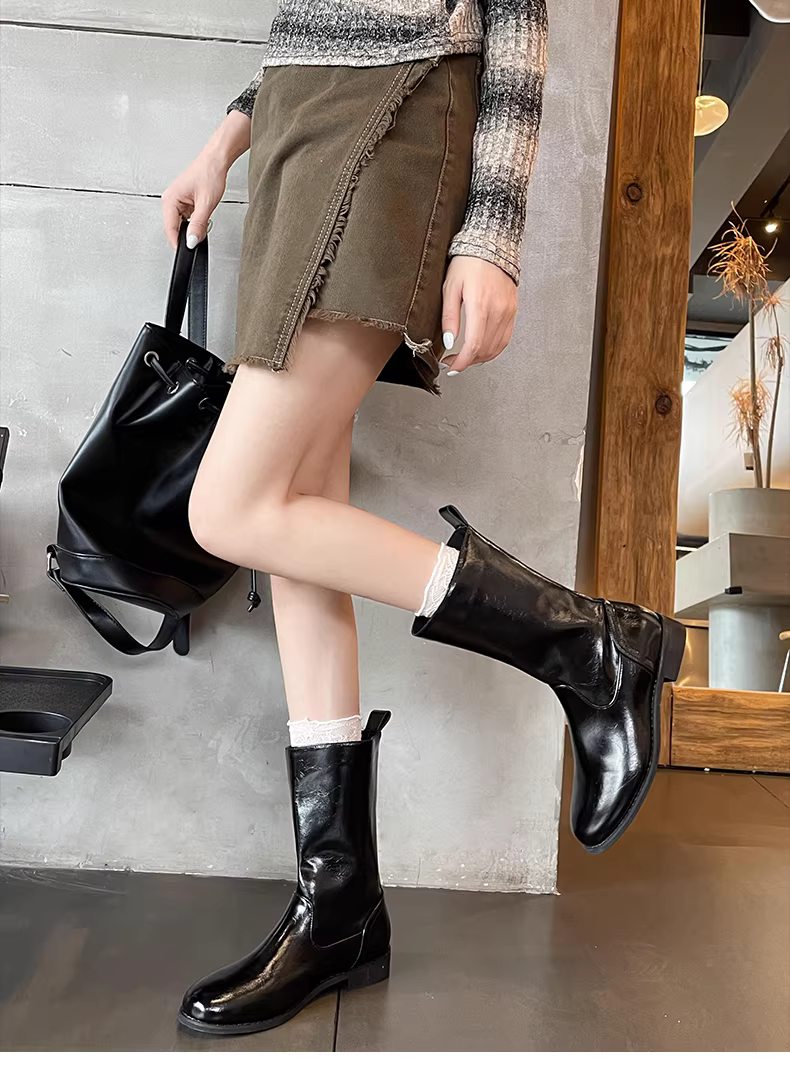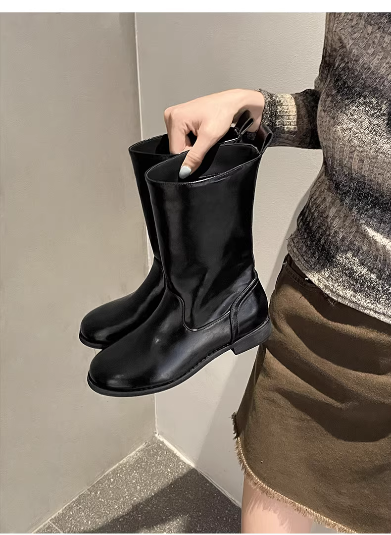 - Giày bốt Martin đế xuồng cao cổ đen phong cách retro dành cho nữ, mẫu mới thu đông 2025 kiểu Anh, chiều cao đến giữa bắp chân.