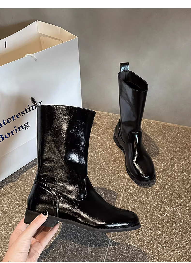 Giày bốt Martin đế xuồng cao cổ đen phong cách retro dành cho nữ, mẫu mới thu đông 2025 kiểu Anh, chiều cao đến giữa bắp chân.