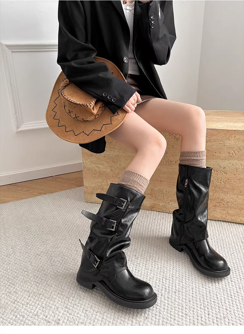 - Giày bốt Martin đế xuồng chunky kiểu Anh đen dành cho nữ, mẫu mới thu đông 2025, tăng chiều cao, tôn dáng, kiểu dáng quần ống rộng.