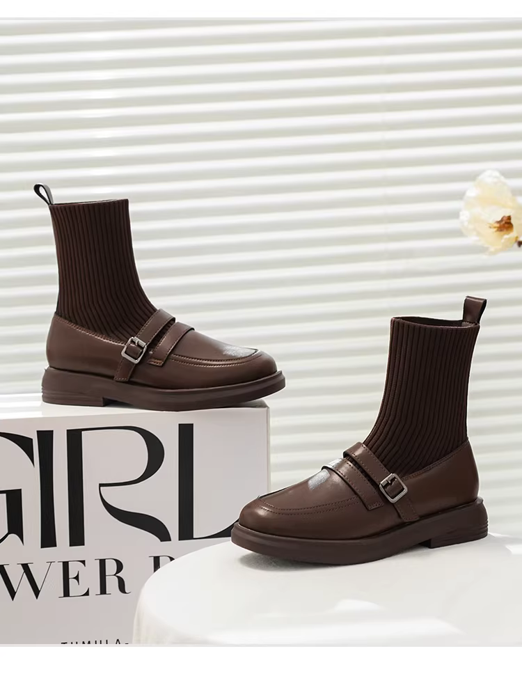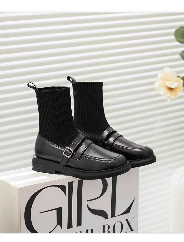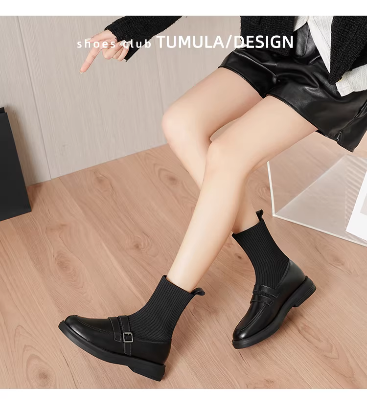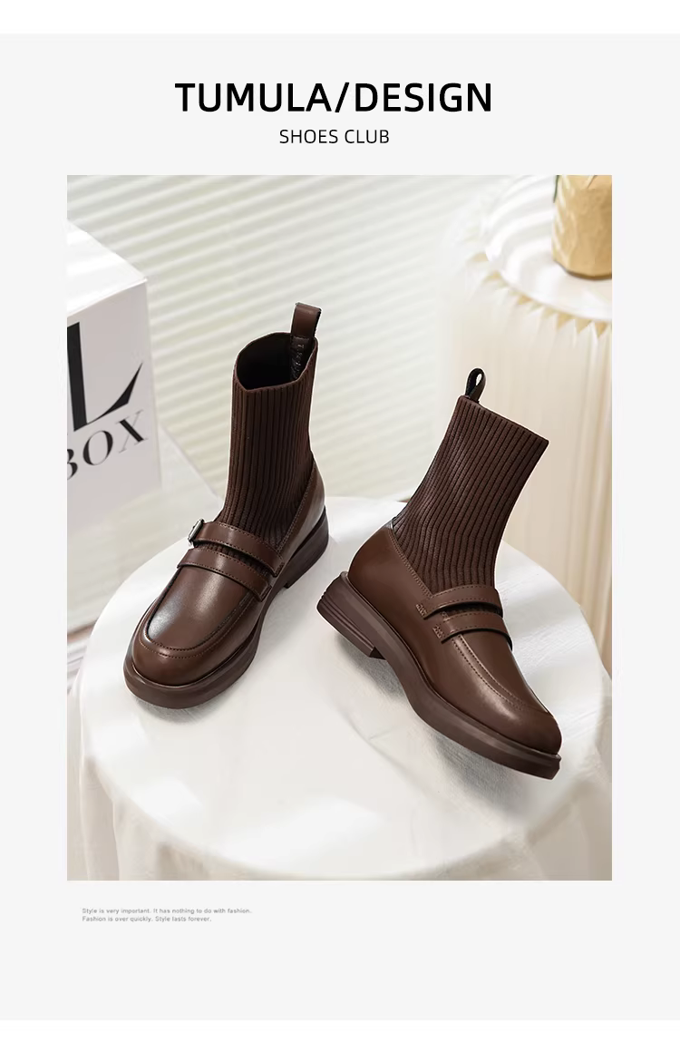 - Giày bốt Martin tăng chiều cao bằng da thật dành cho nữ, bốt dáng ôm phong cách Anh, bốt ngắn đế dày, bốt tất thun co giãn thon gọn, lót lông cừu mùa đông.