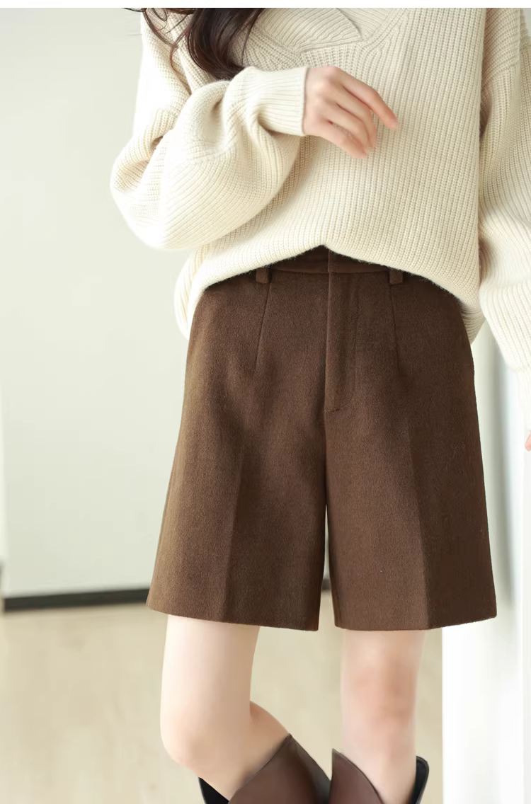 Giày bốt mùa thu đông, quần short len đa năng, thanh lịch và giản dị dành cho nữ, quần cạp cao, tôn dáng, kiểu dáng vest, quần năm điểm để mặc ngoài