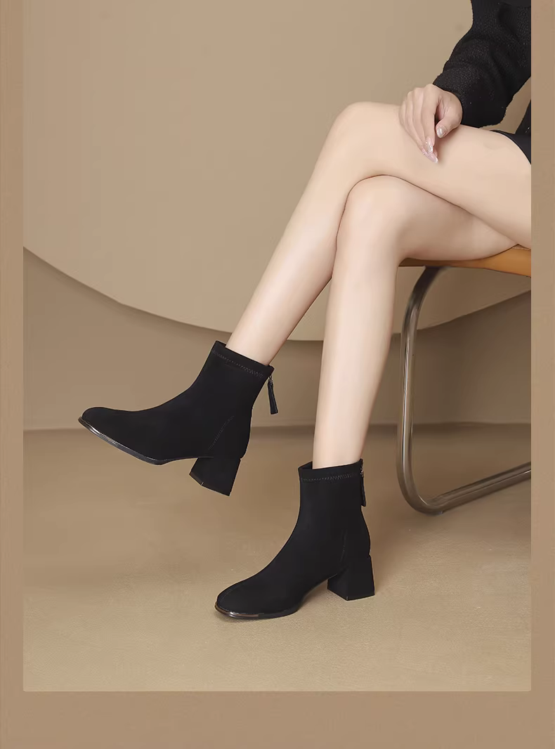 - Giày bốt ngắn da lộn Daphne dành cho nữ 2025, mẫu mới mùa thu, kiểu Pháp, gót cao, ôm chân, gót thô, kiểu Martin, giày thời trang dành cho nữ