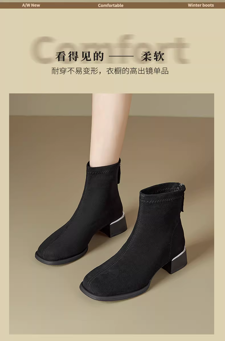- Giày bốt ngắn da lộn đen Dadong dành cho nữ, mùa thu đông 2025, kiểu dáng ôm sát, chất liệu thun, gót dày, kiểu Chelsea.