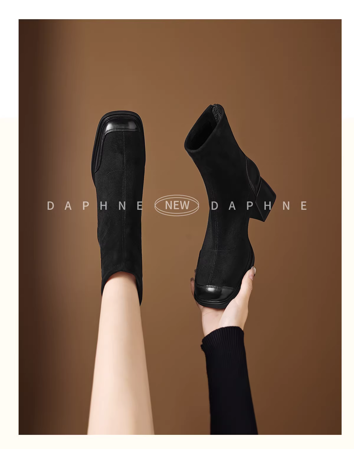 - Giày bốt ngắn đen Daphne dành cho nữ, kiểu mới 2025, rất đẹp, kiểu Pháp, giày cao gót nữ, chất liệu thun ôm sát.