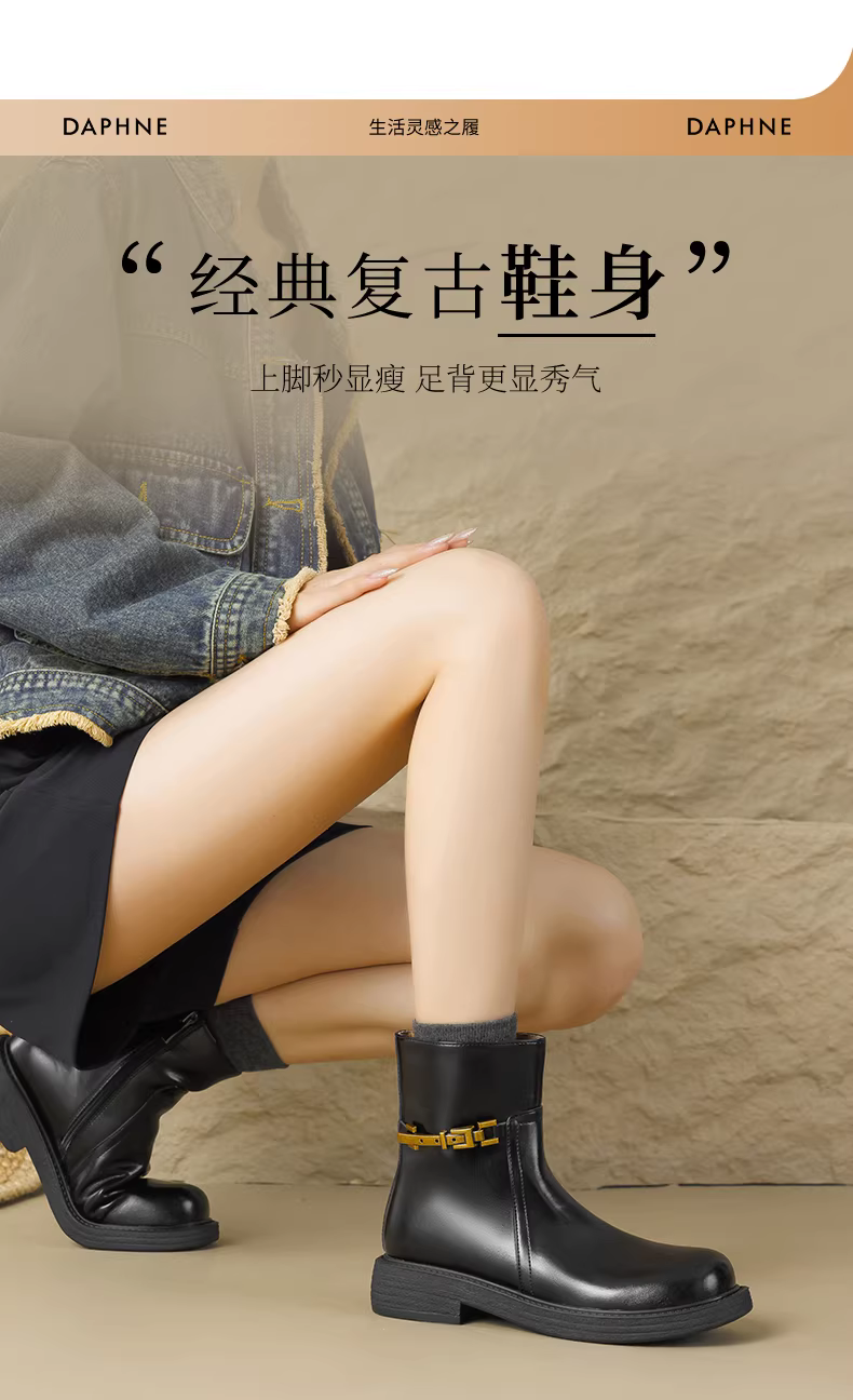 - Giày bốt ngắn đen Daphne dành cho nữ, mẫu mới thu đông 2025, phong cách Anh, kiểu bốt Martin đi xe máy, gót dày, khóa vàng, kiểu dáng ôm sát.