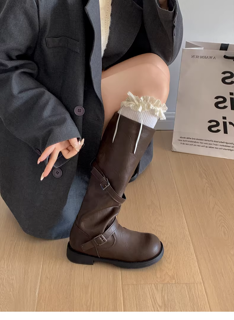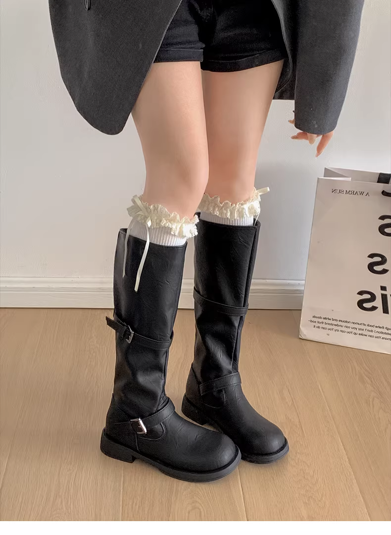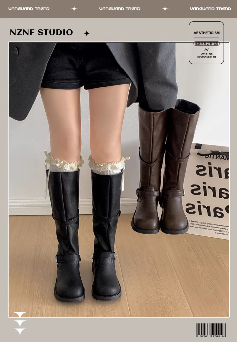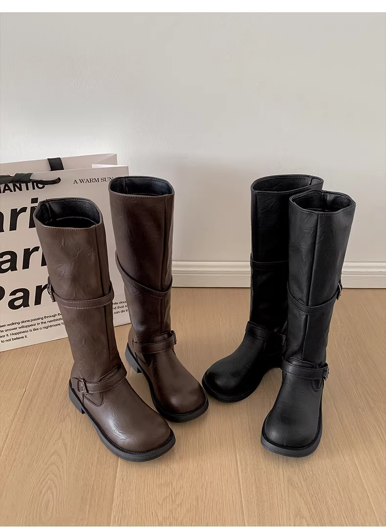 - Giày bốt nữ cao đến đùi kiểu Anh đen, đế dày, mùa thu đông 2025, kiểu dáng thon gọn, cổ điển, phong cách hiệp sĩ