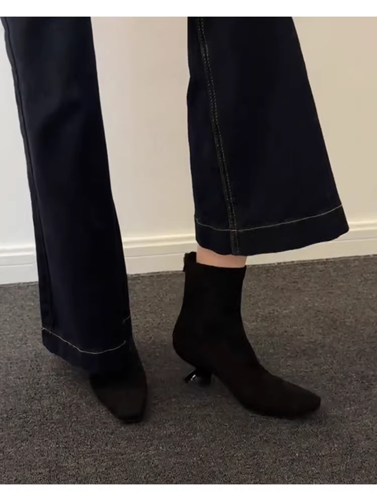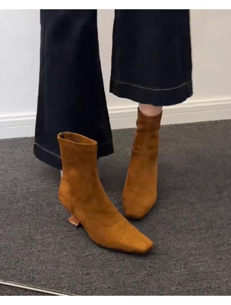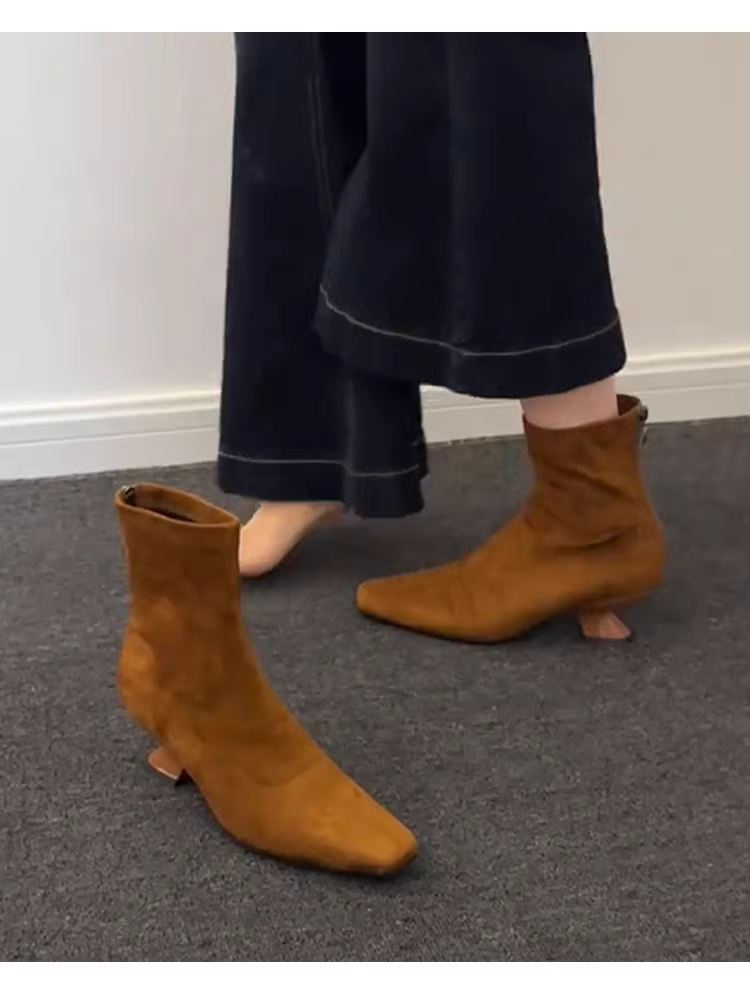 Giày bốt nữ da lộn kiểu cổ điển, mũi vuông, khóa kéo sau, gót wedge, kiểu dáng đơn giản, thanh lịch, thời trang, cổ ngắn.