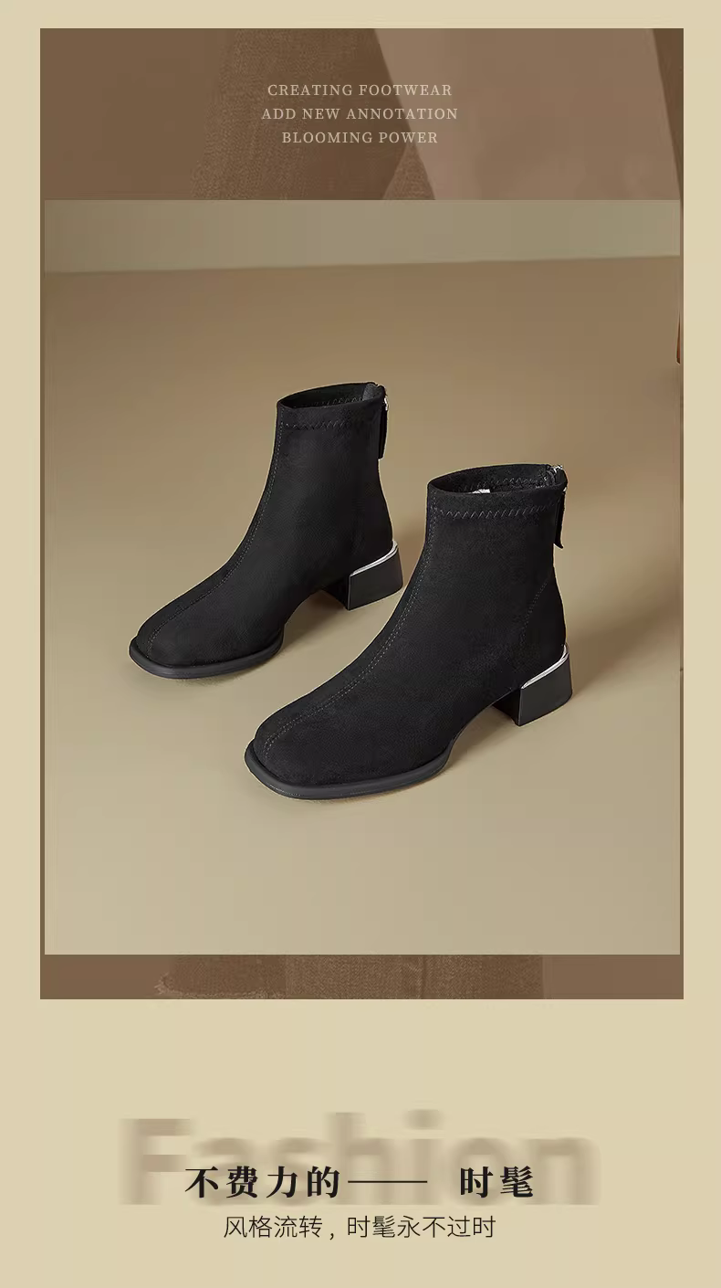 - Giày bốt nữ Dadong chất liệu da lộn đen, kiểu dáng ôm sát, đế cao gót vuông, cổ ngắn, lót lông, kiểu Chelsea, mùa thu đông 2025.