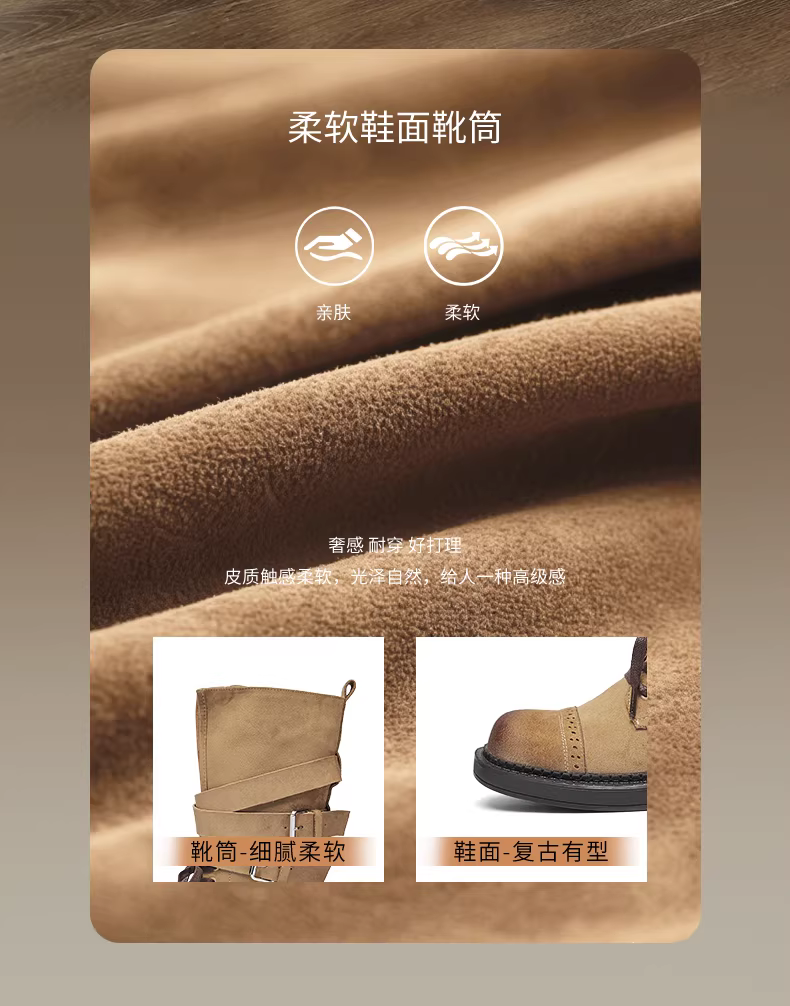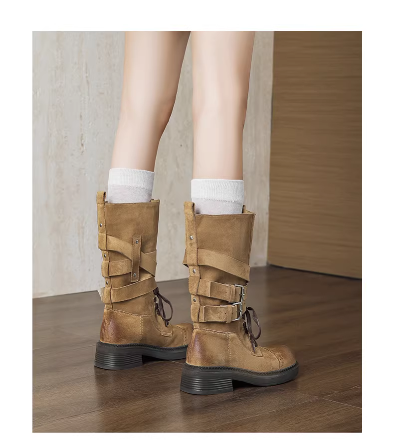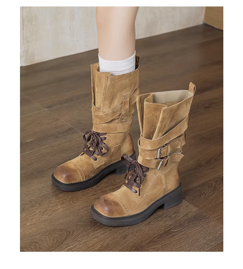 - Giày bốt nữ Daphne Maillard cao đến giữa bắp chân, mùa thu đông 2025, kiểu retro mới, có khóa thắt lưng, kiểu giày boxing, kiểu giày Martin đi xe máy