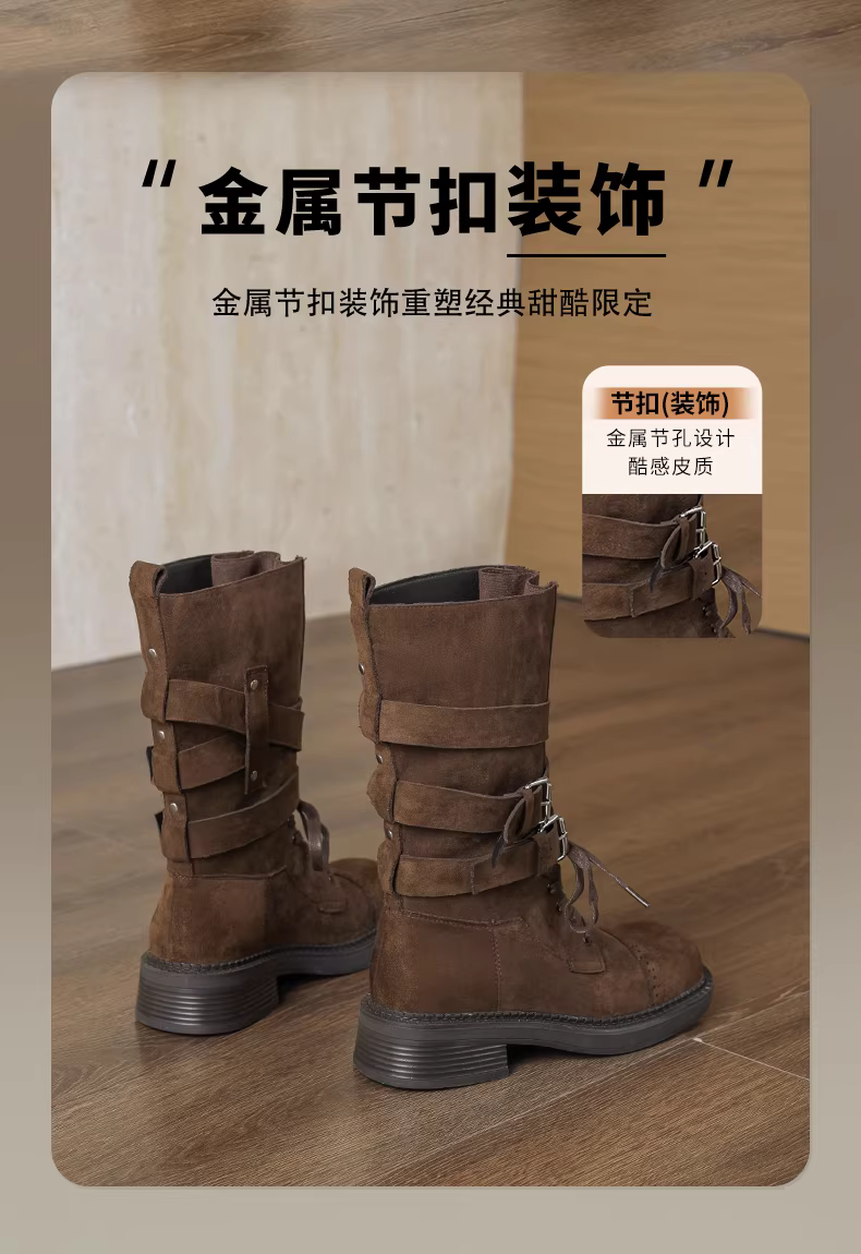 Giày bốt nữ Daphne Maillard cao đến giữa bắp chân, mùa thu đông 2025, kiểu retro mới, có khóa thắt lưng, kiểu giày boxing, kiểu giày Martin đi xe máy