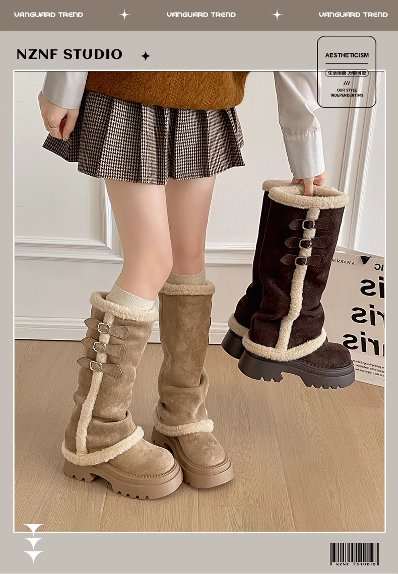 - Giày bốt nữ đế dày gót vuông cổ cao lót lông giữ ấm kiểu retro mùa đông 2025 mới, tăng chiều cao, tôn dáng, kiểu quần ống rộng chất liệu cotton