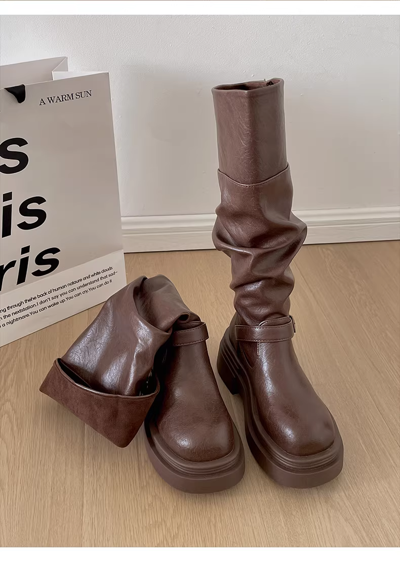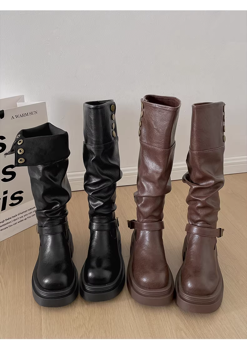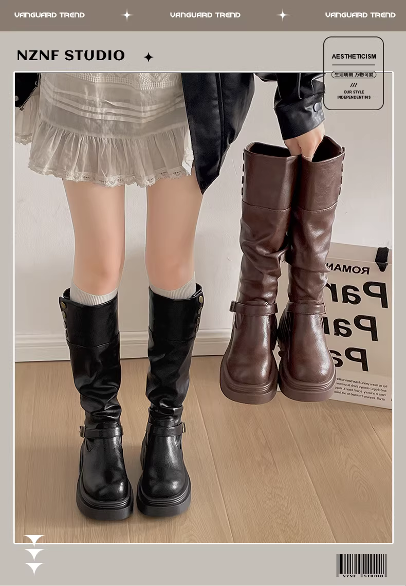 - Giày bốt nữ đế dày kiểu Anh, gót thô, dáng dài, mùa thu đông 2025, kiểu dáng thon gọn, phong cách Melard Knight