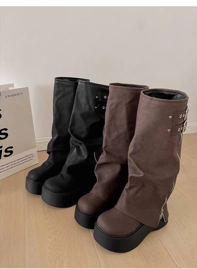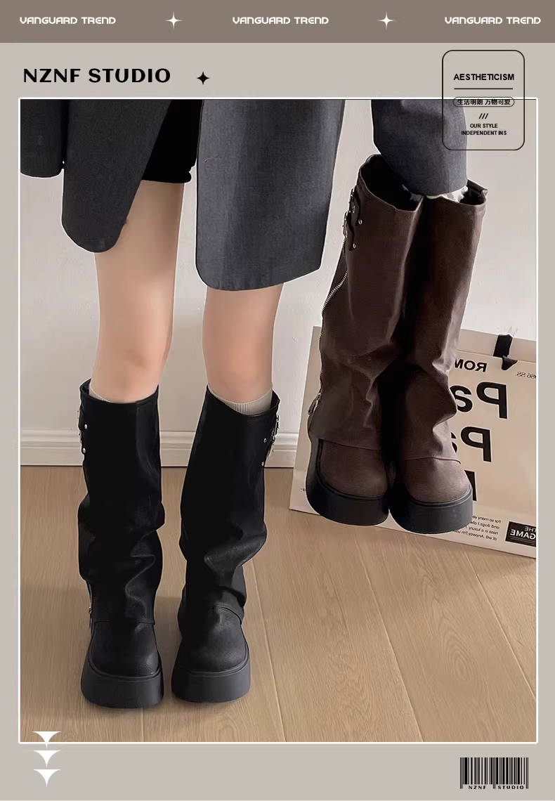 Giày bốt nữ đế dày kiểu Anh màu nâu, bốt dài mùa thu đông 2025, tăng chiều cao, tôn dáng, kiểu ống quần dành cho nữ nhỏ nhắn