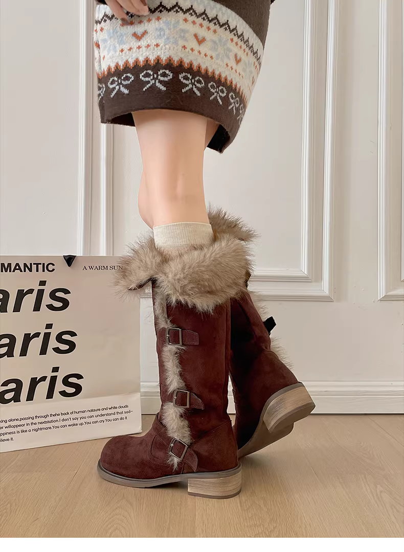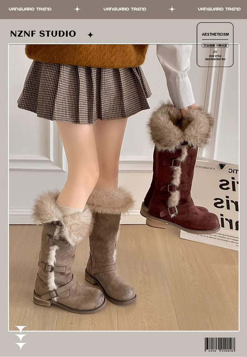 - Giày bốt nữ đế dày, lót lông cừu, kiểu dáng cổ điển, giữ ấm, mùa đông 2025, kiểu dáng thon gọn.