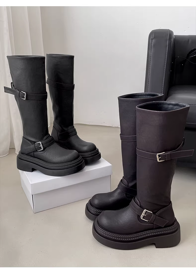 - Giày bốt nữ đế dày màu đen, bốt cao cổ, kiểu Anh mới thu đông 2025, tăng chiều cao và thon gọn dáng người.