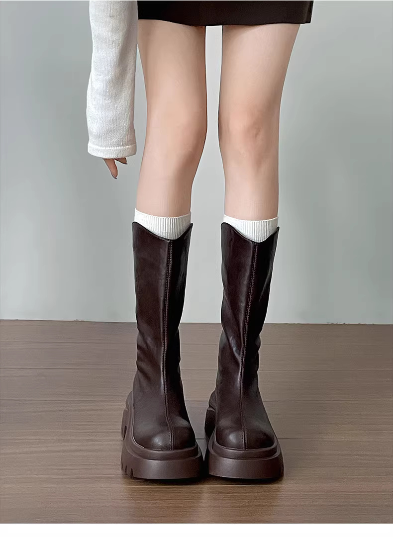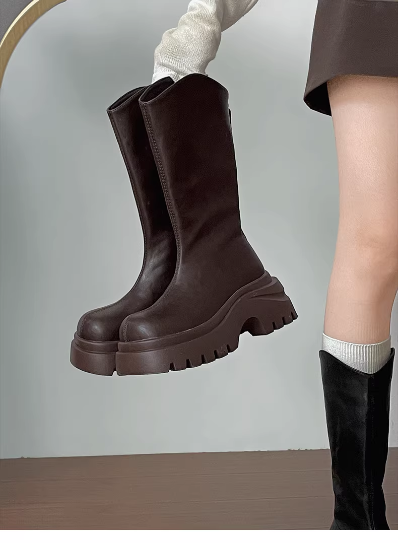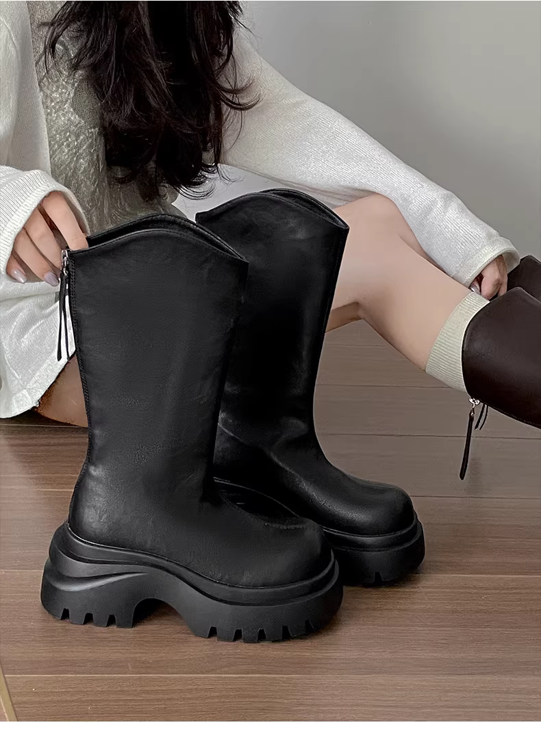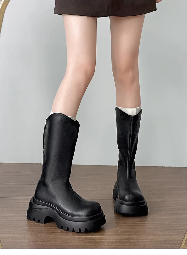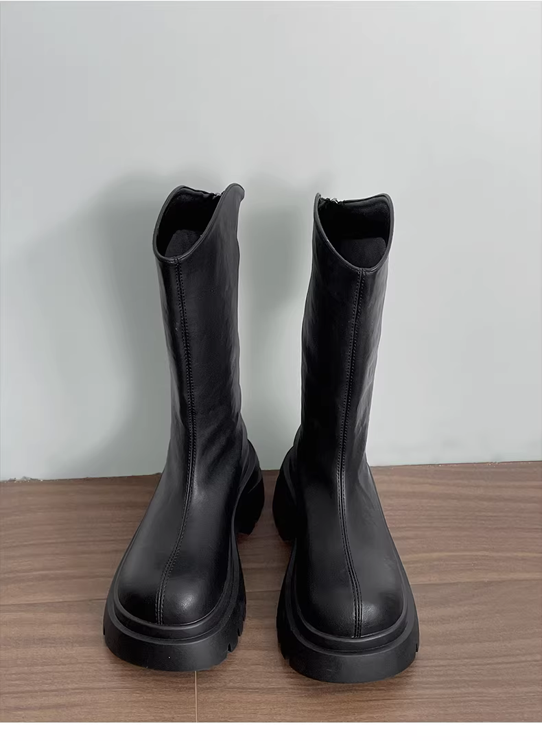 Giày bốt nữ đế dày phong cách Anh cổ điển màu đen, kiểu bốt đến giữa bắp chân, kiểu thu đông 2025 mới, giày bốt đa năng phối chân váy