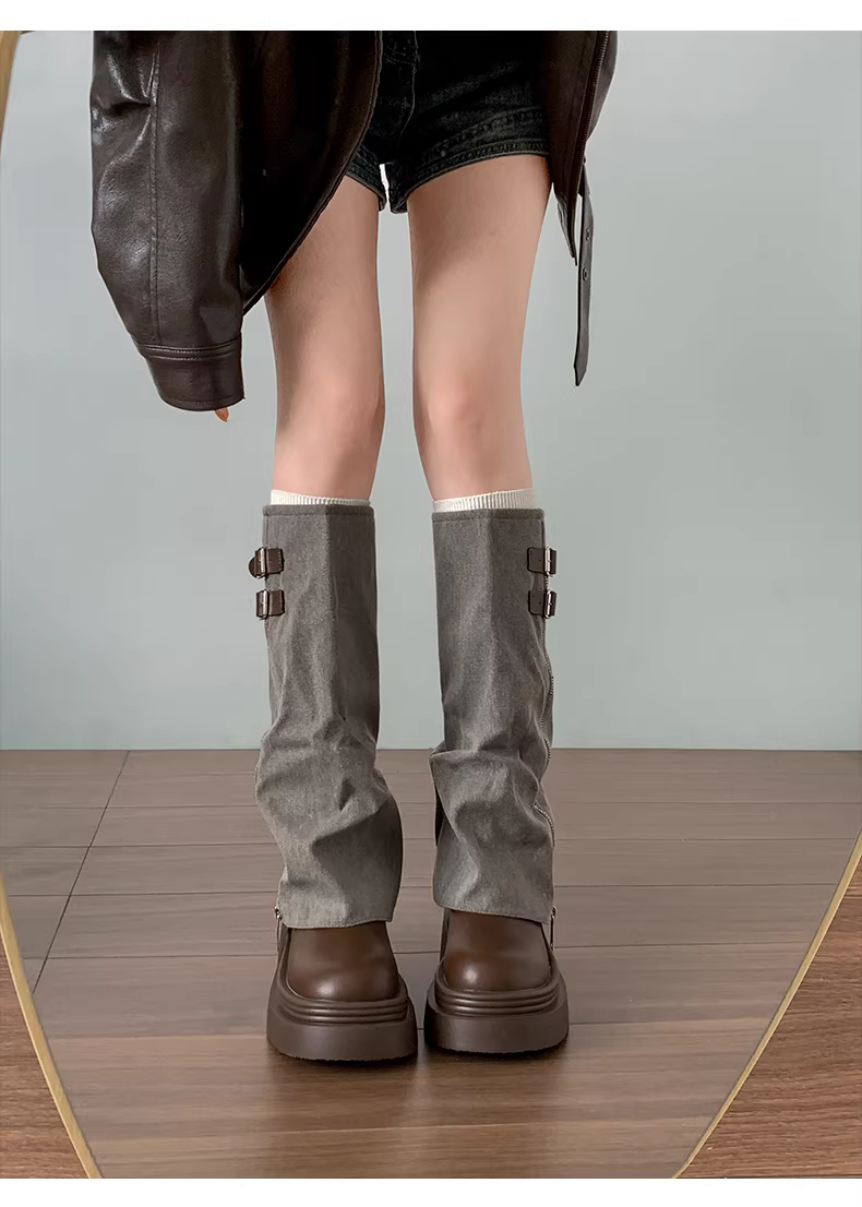 - Giày bốt nữ đế dày phong cách Anh cổ điển, mẫu mới thu đông 2025, phối chân váy, kiểu dáng ôm chân, chất liệu denim.