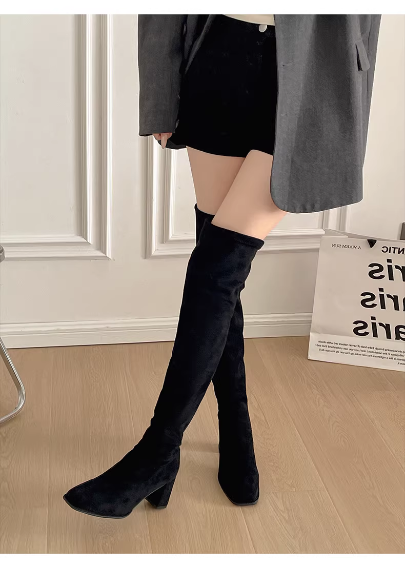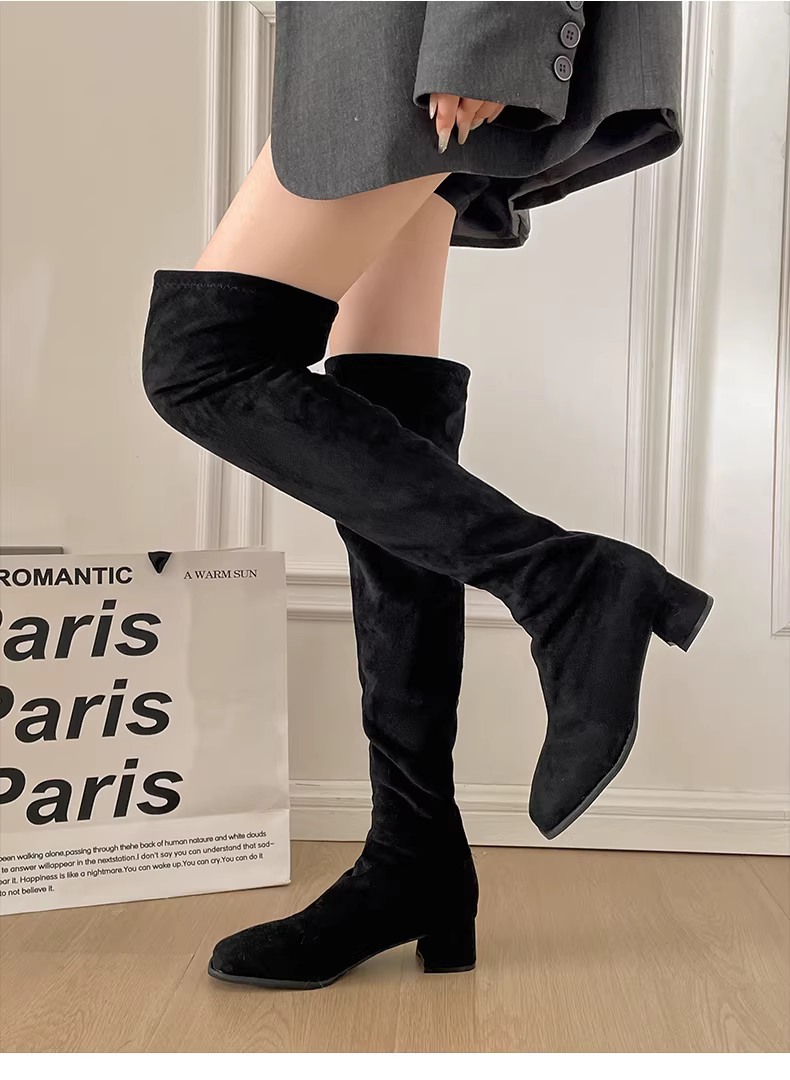 Giày bốt nữ kiểu Anh cổ điển, ấm áp, gót dày, mẫu mới mùa đông 2025, phối chân váy, kiểu dáng ôm dáng, cao quá đầu gối
