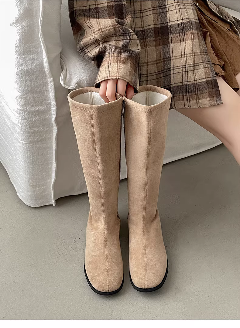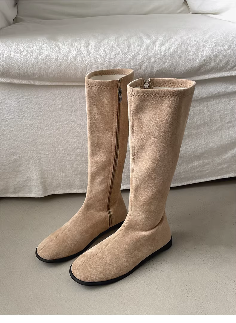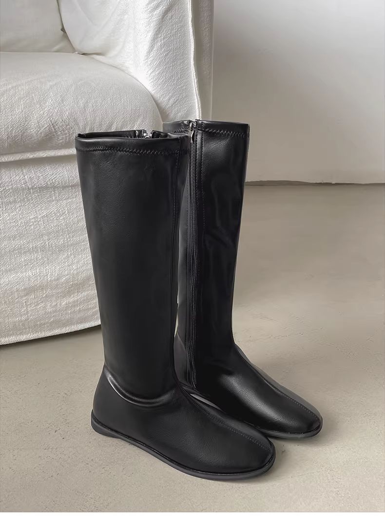 - Giày bốt nữ kiểu Anh đen, dáng ôm, đế bằng, cao đến đầu gối, đa năng, mùa thu đông 2025, kiểu dáng mới