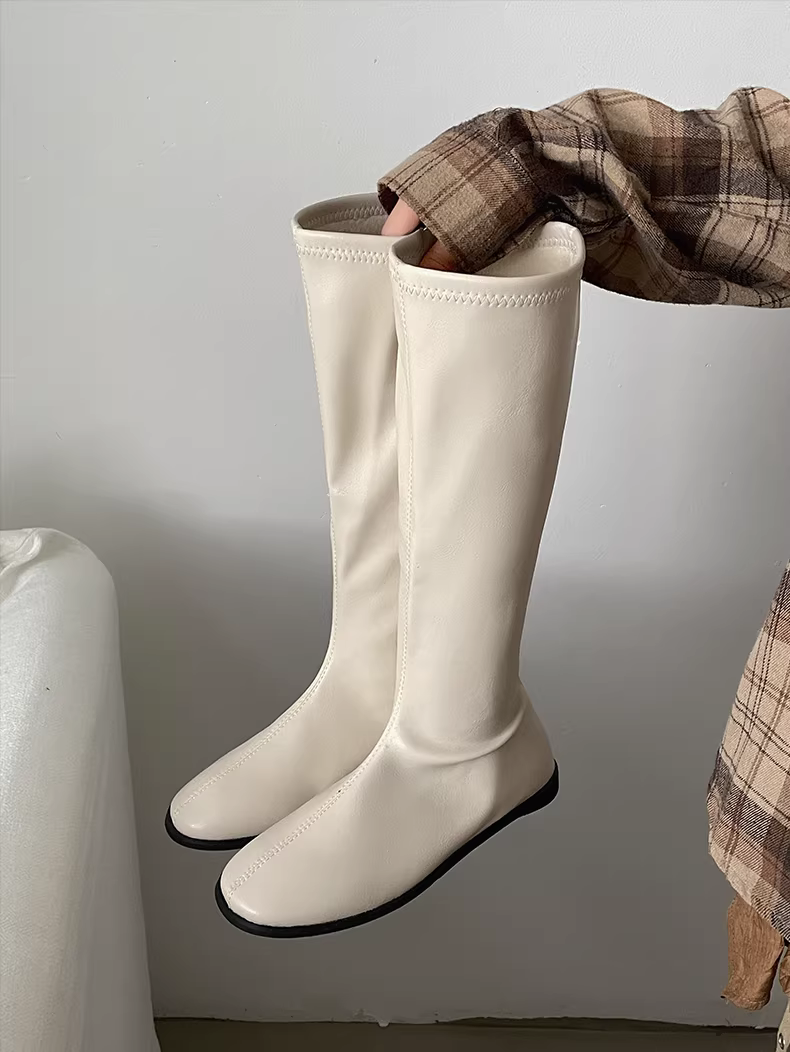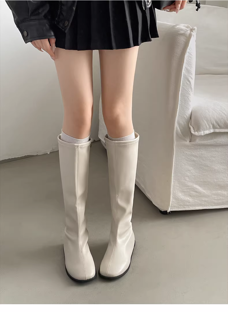 Giày bốt nữ kiểu Anh đen, dáng ôm, đế bằng, cao đến đầu gối, đa năng, mùa thu đông 2025, kiểu dáng mới