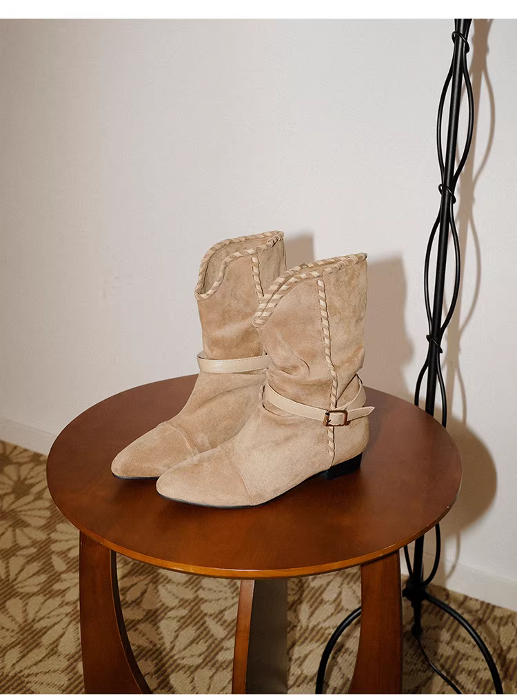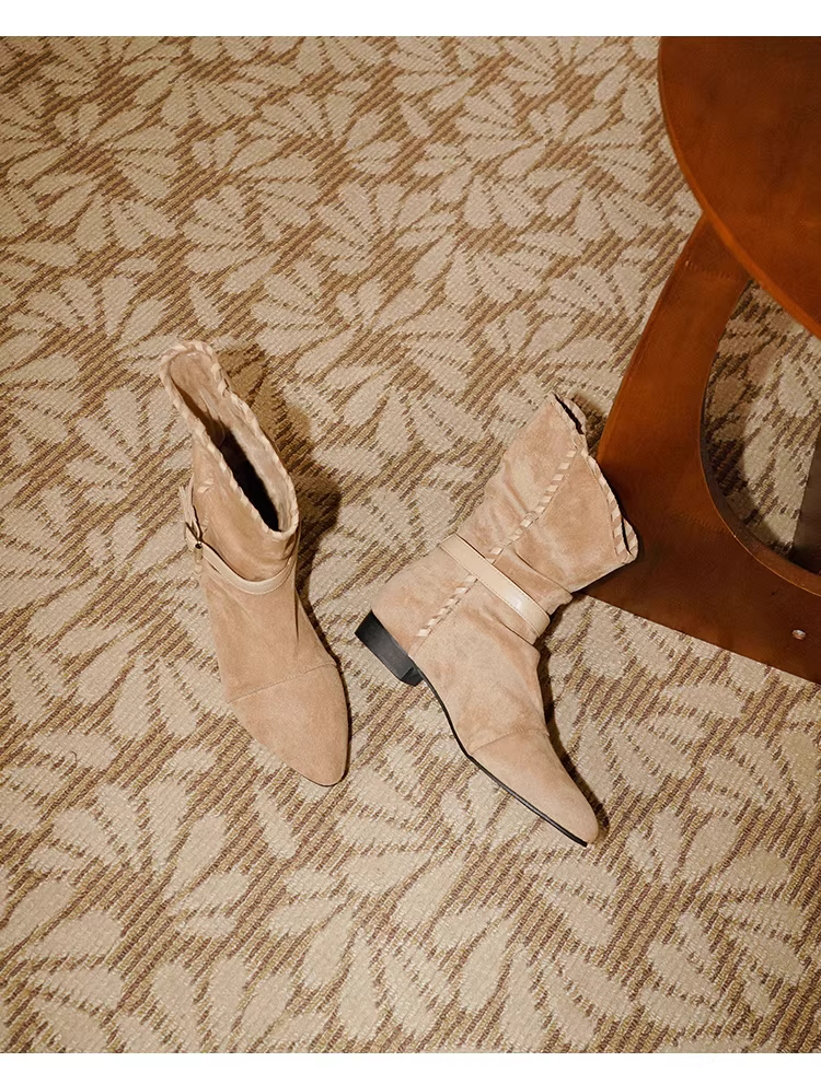 - Giày bốt nữ mùa thu đông kiểu dáng thời trang, phong cách phương Tây, chất liệu da lộn cổ điển, có khóa thắt lưng, kiểu xếp ly chữ V, đế cao.