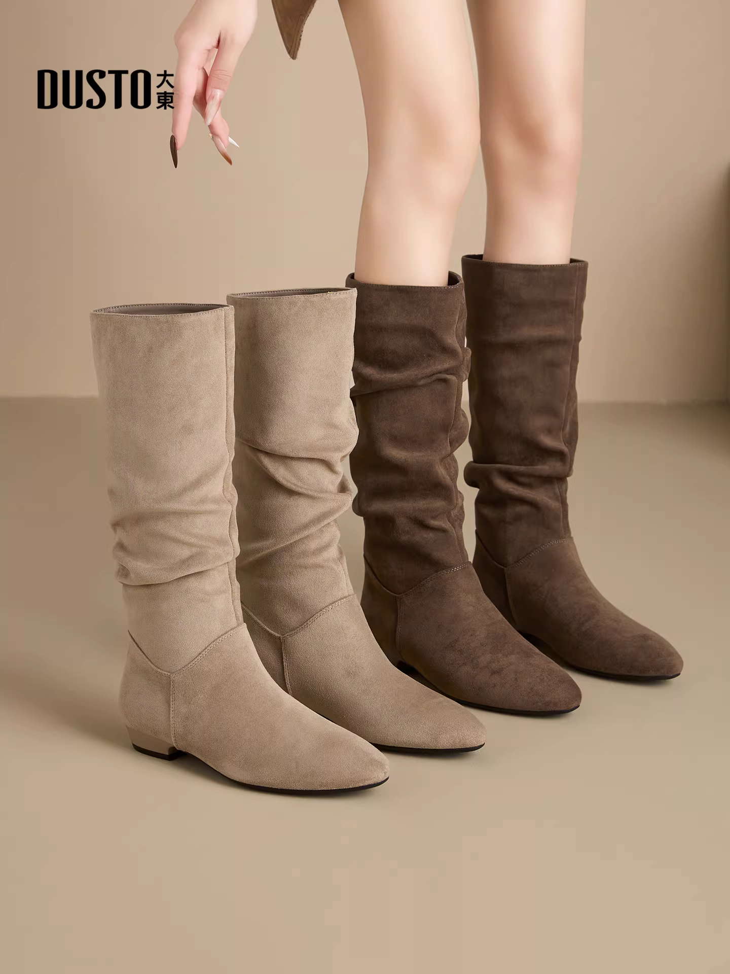 - Giày bốt nữ mũi nhọn cao cổ mùa đông 2025 kiểu retro, lót lông Melard, xếp ly, đế dày
