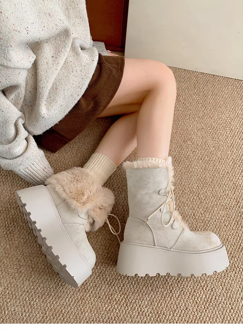 Giày bốt tuyết đế dày chống trơn kiểu retro màu trắng dành cho nữ, mẫu mới mùa đông 2025, giữ ấm, tăng chiều cao, chất liệu cotton