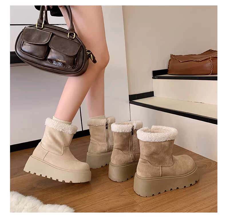 Giày bốt tuyết nữ đế dày phong cách retro màu trắng, kiểu Birkenstock, giữ ấm, tăng chiều cao, mùa đông 2025 mới
