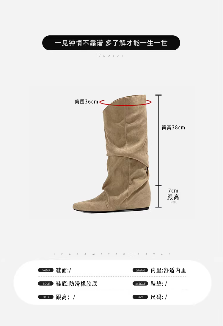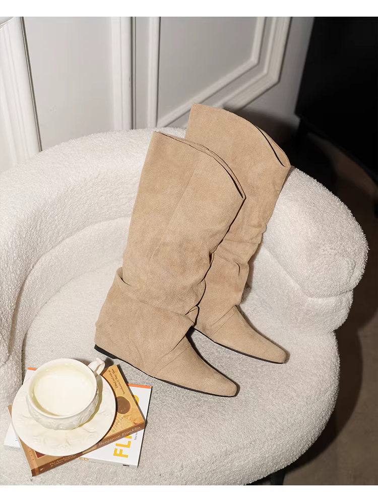 Giày cao cổ da lộn kiểu V đơn giản, tăng chiều cao, dành cho nữ, kiểu dáng cổ điển đa năng, mũi nhọn, xếp ly, kiểu dáng thời trang.