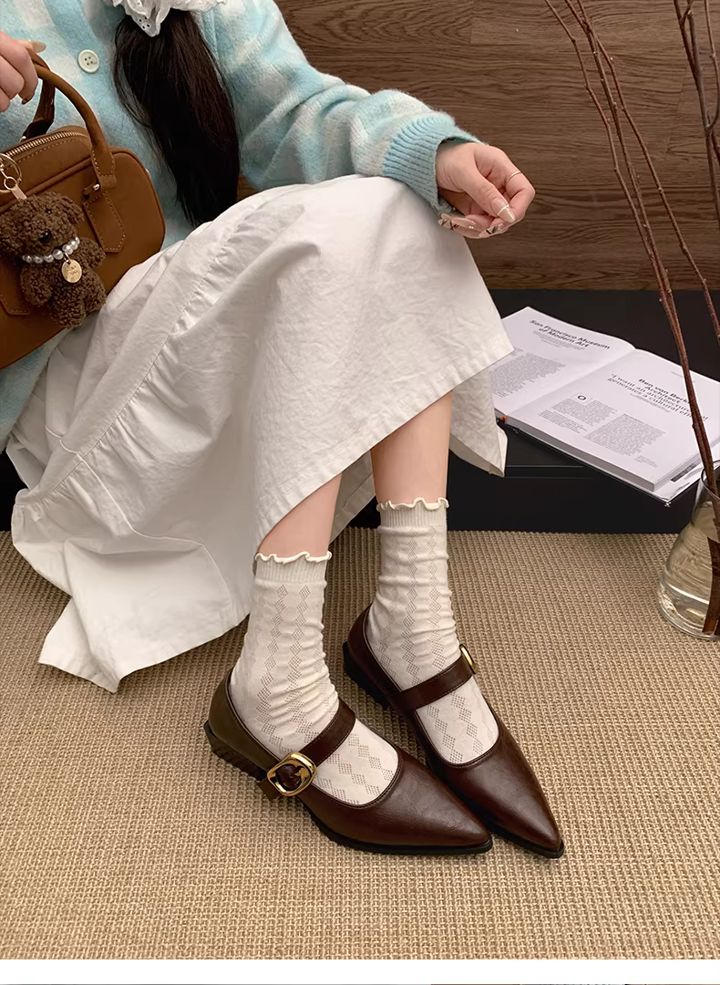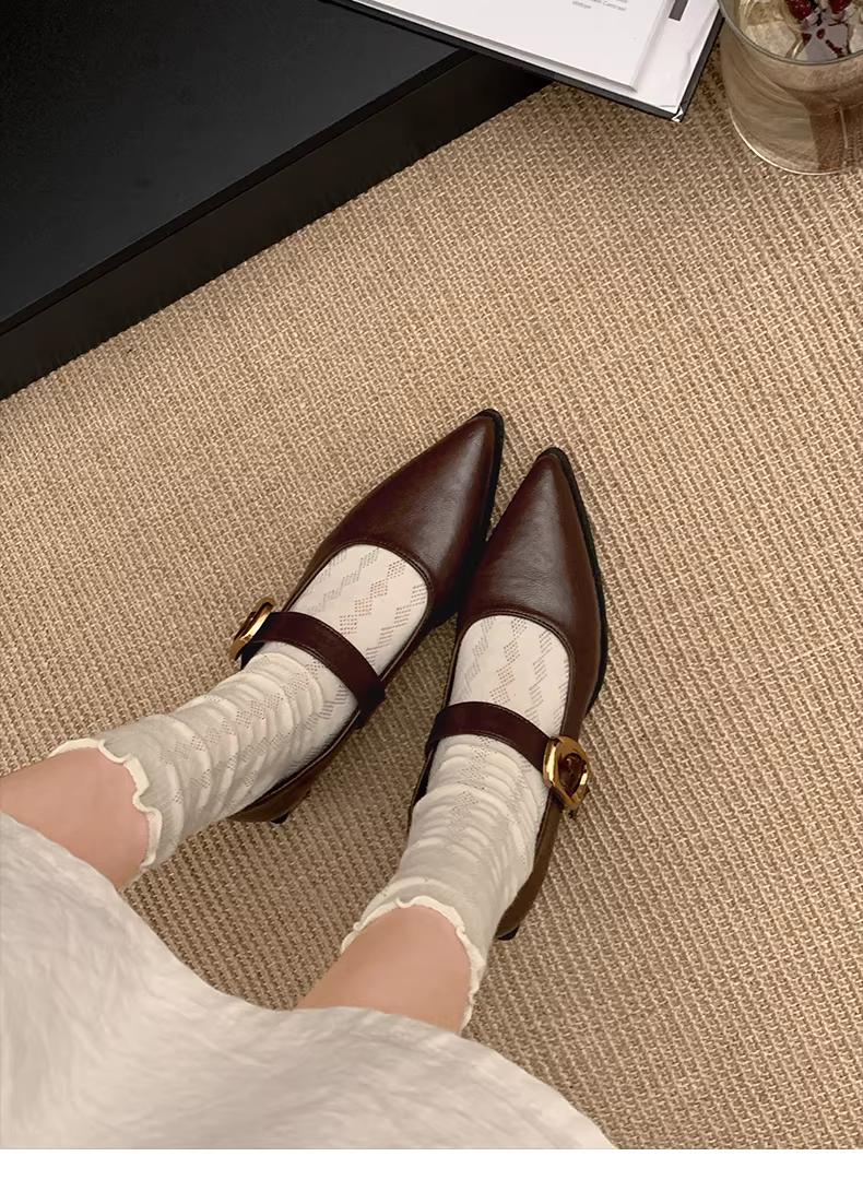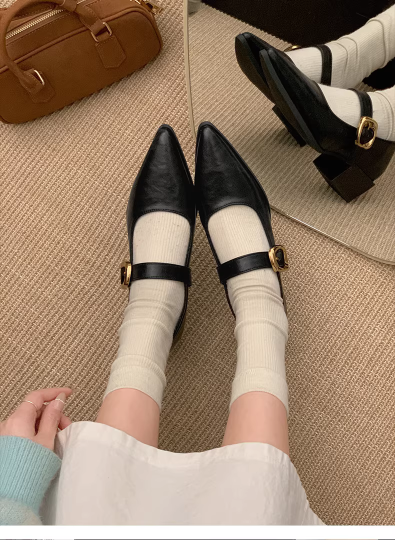 Giày cao gót chunky mũi nhọn đế thấp dành cho nữ, mẫu mới thu đông 2025, kiểu Mary Jane đa năng phong cách Pháp.