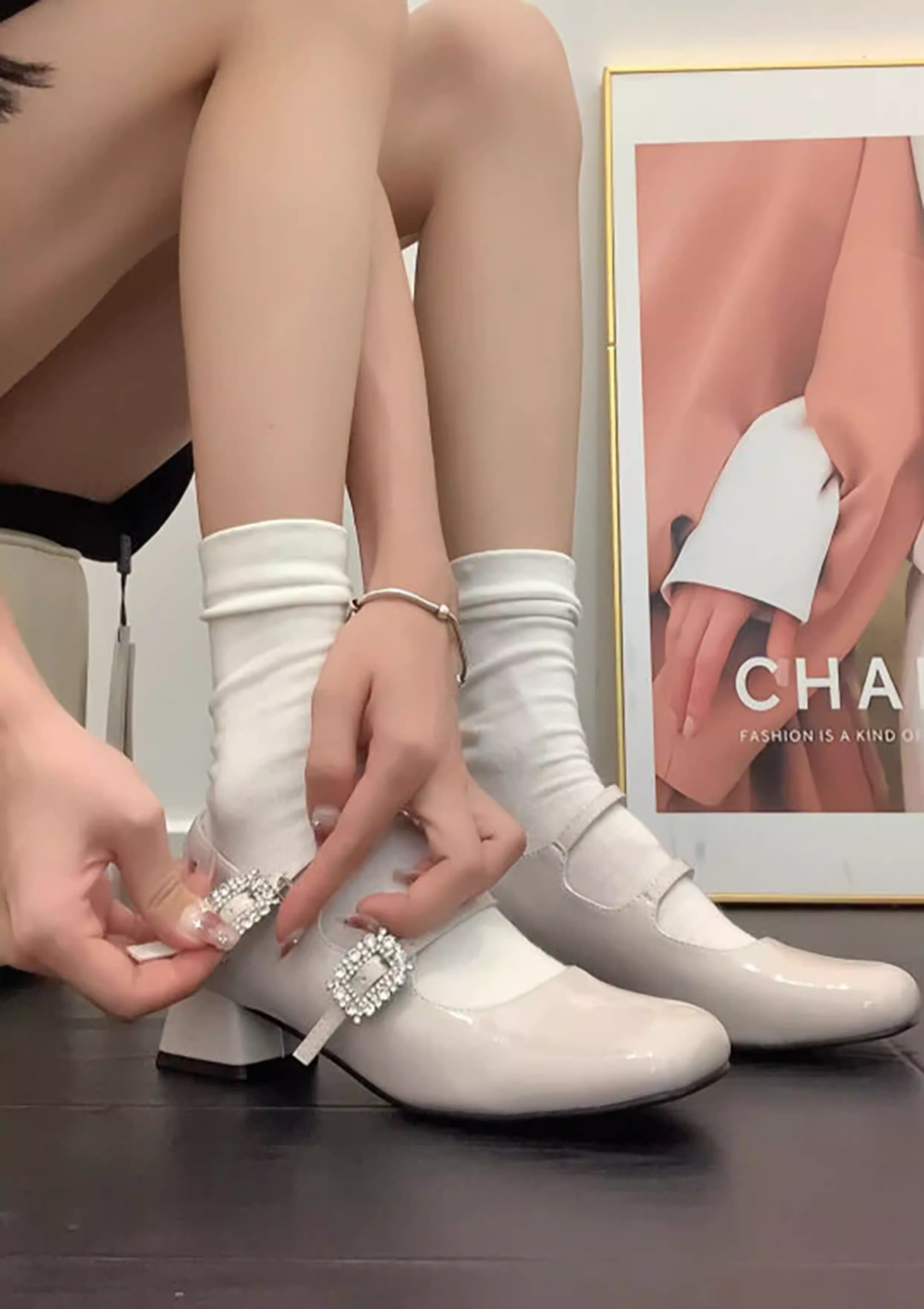 Giày cao gót Mary Jane mũi vuông da cừu thật, đính đá, gót thô, kiểu Pháp, phong cách dạ hội cổ điển, giày da nhỏ dành cho nữ