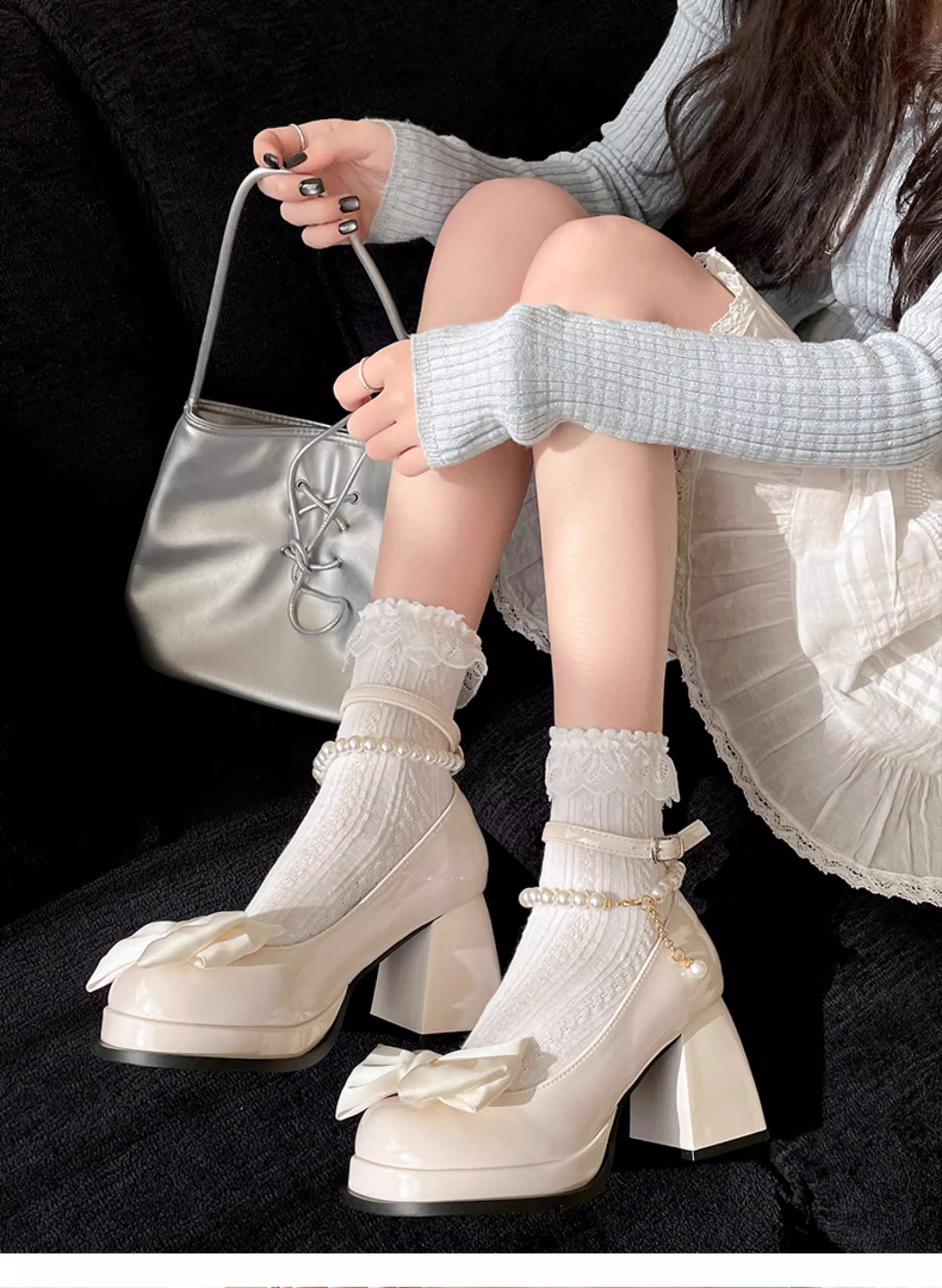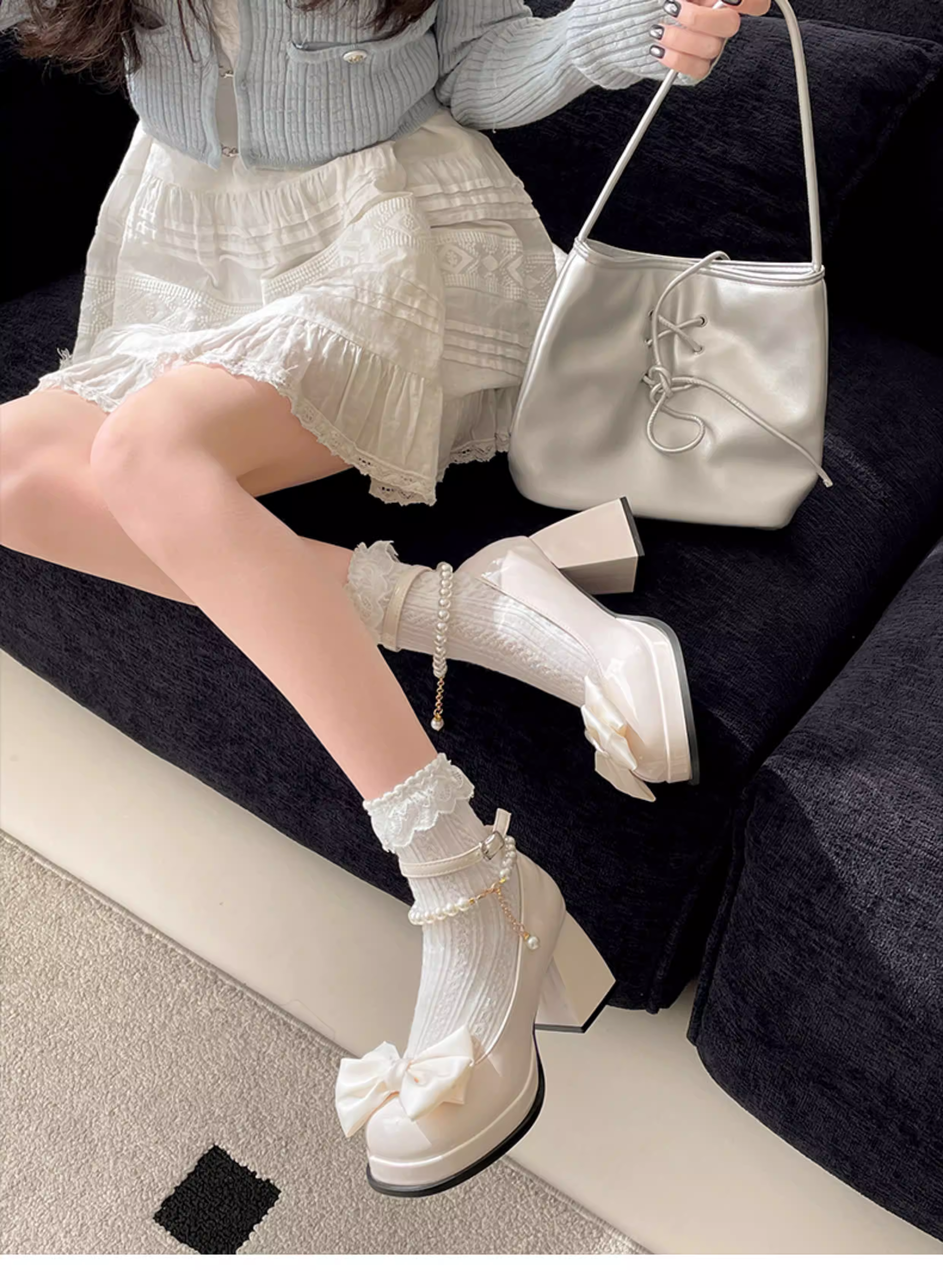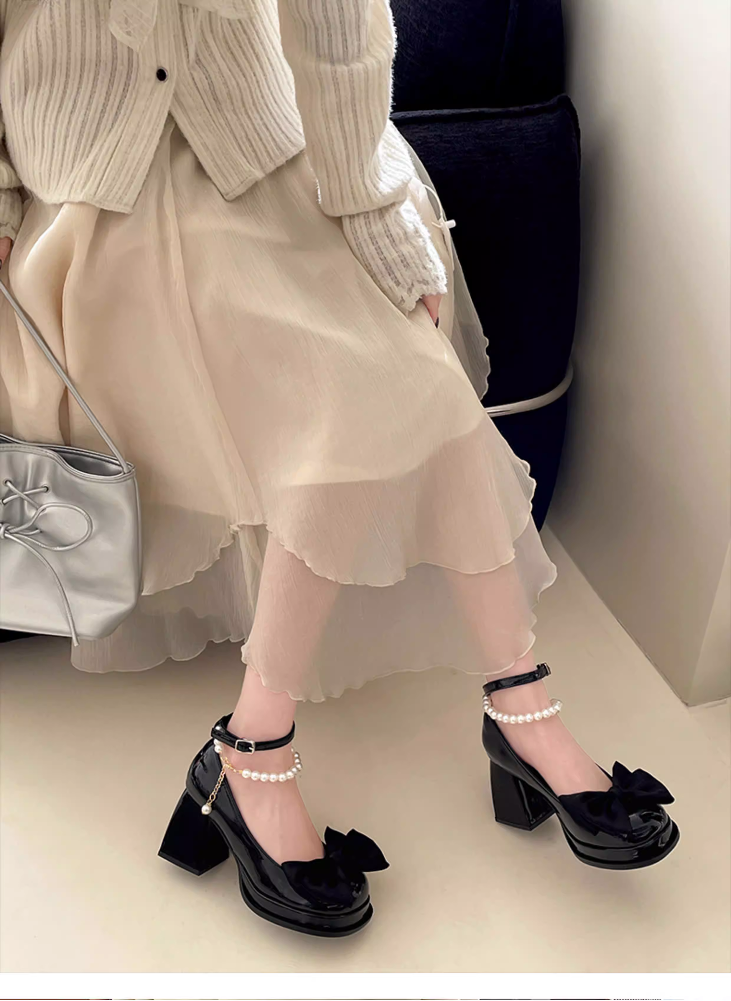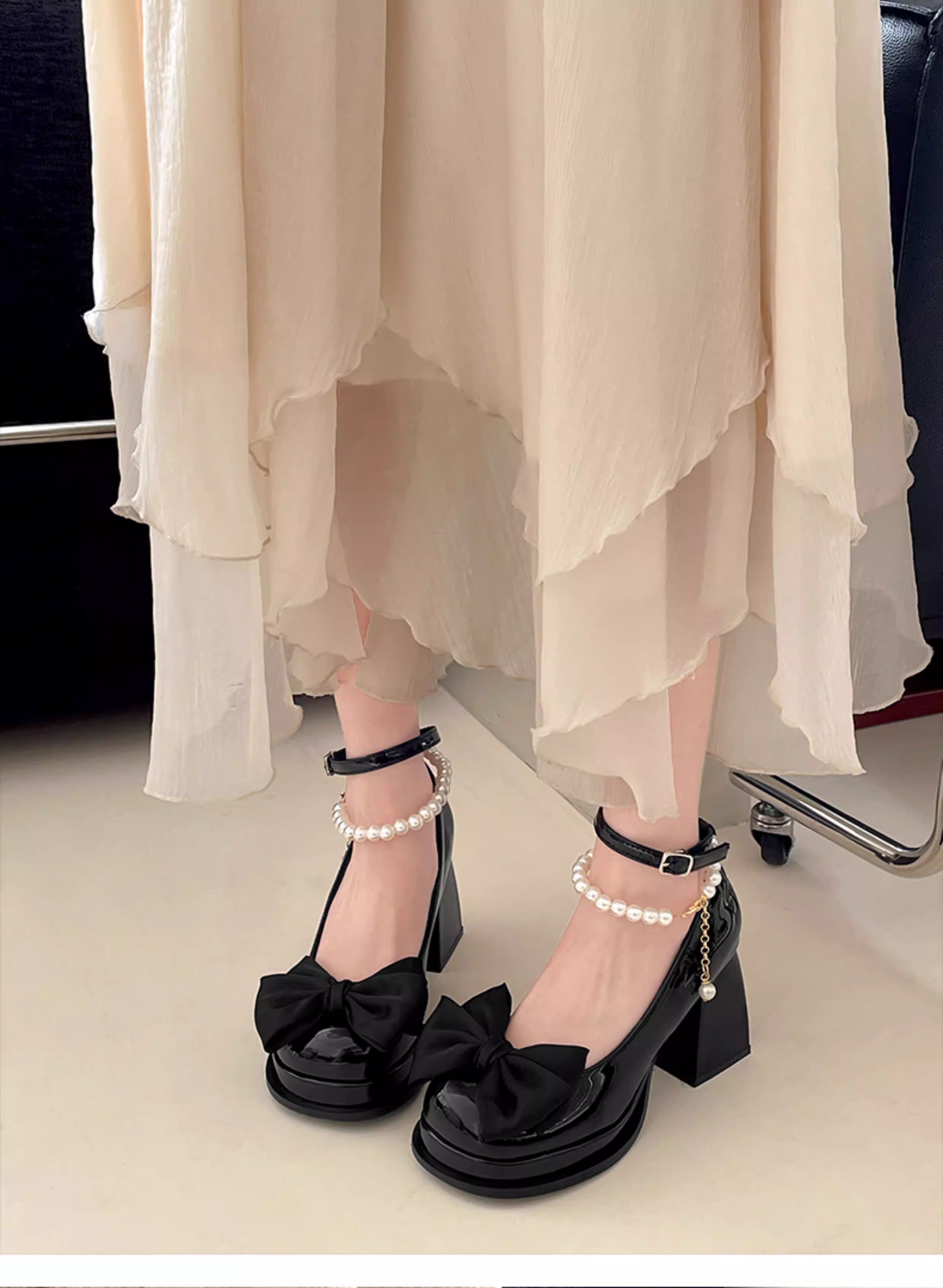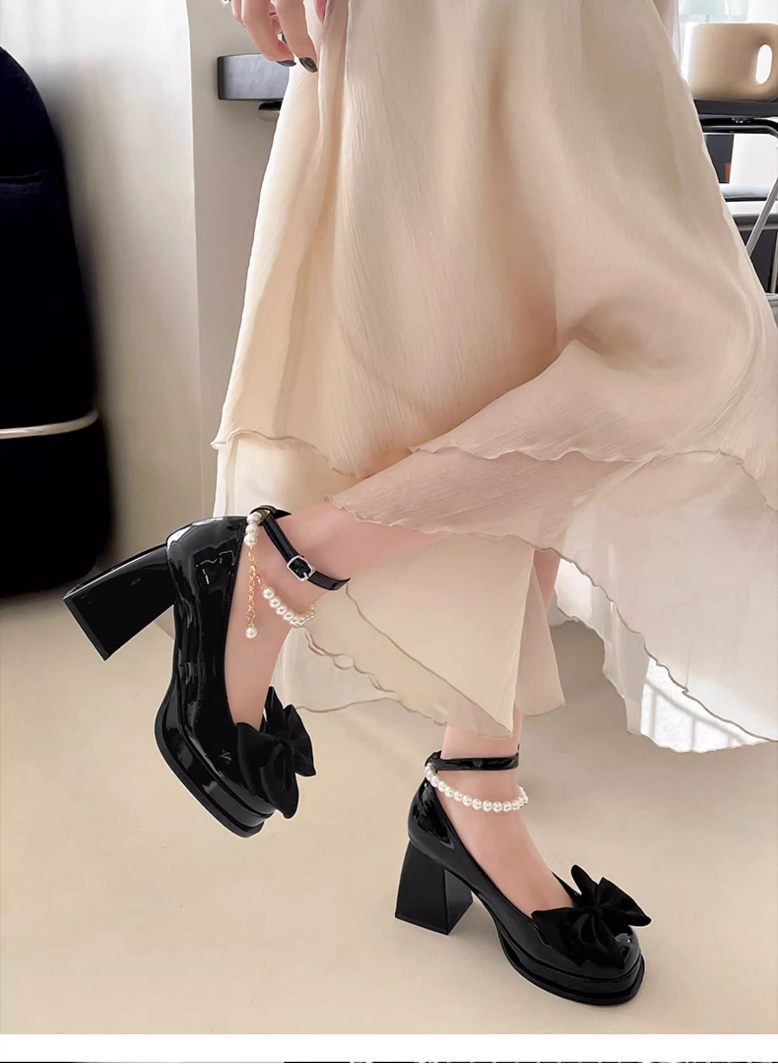 - Giày cao gót nữ đế thô kiểu retro màu trắng, kiểu Mary Jane, chất liệu da, mùa thu mới 2025, kiểu Pháp, mũi nông