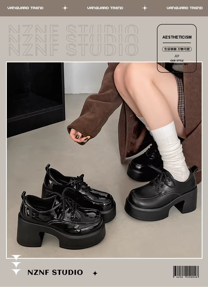 Giày da cao gót chunky kiểu Anh cổ điển màu đen dành cho nữ, mẫu mới thu 2025, tăng chiều cao, kiểu buộc dây, dành cho người thấp.