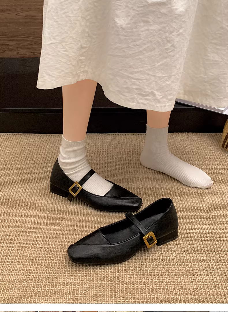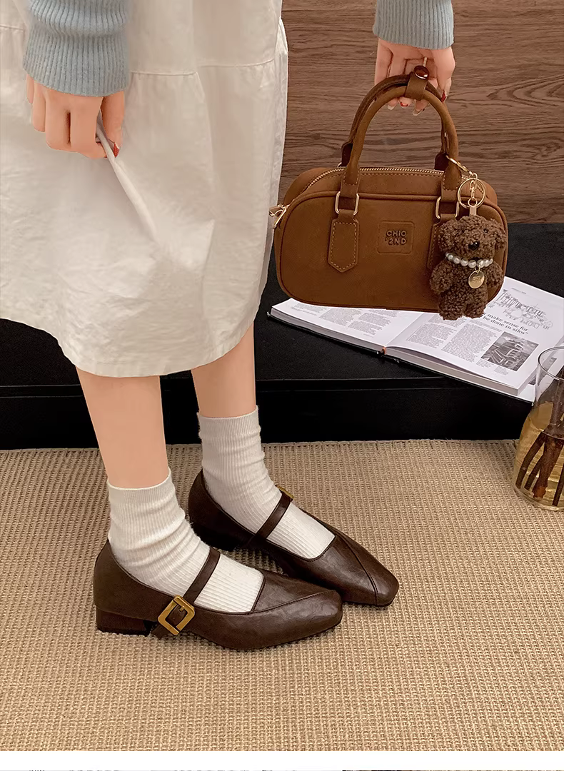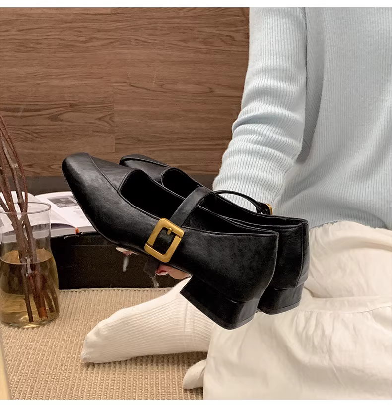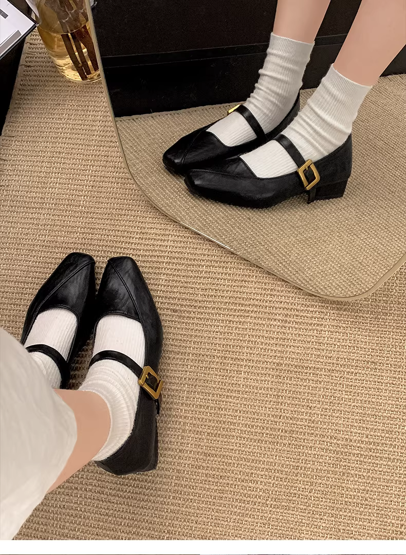 - Giày da cao gót chunky kiểu Pháp cổ điển dành cho nữ, giày mũi vuông mùa thu mới 2025 phối chân váy, giày Mary Jane.