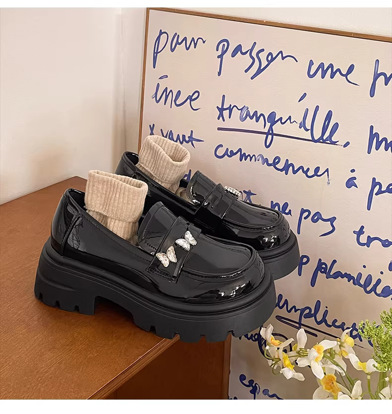 Giày da đế dày kiểu Anh cổ điển màu đen dành cho nữ, mẫu mới thu đông 2025, kiểu Pháp đa năng, kiểu lười