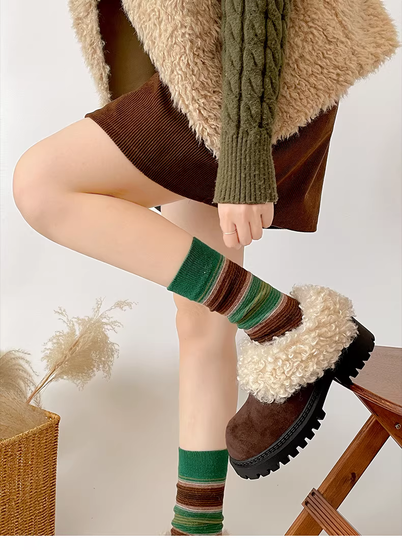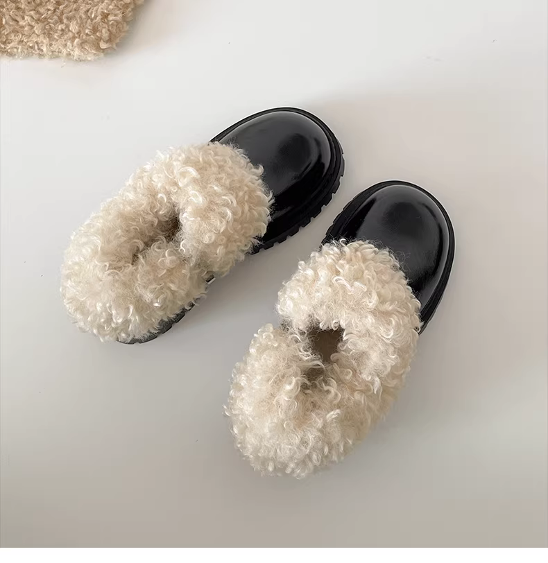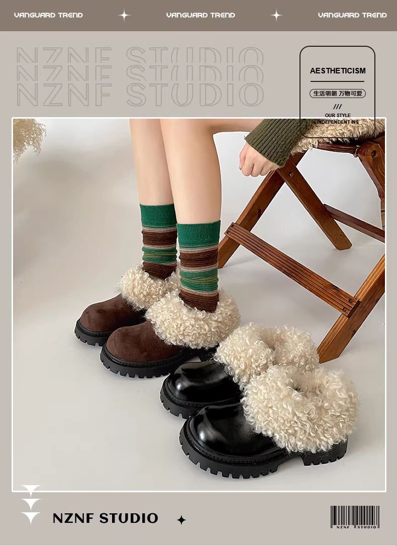 - Giày da đế dày phong cách retro đen dành cho nữ, kiểu dáng thu đông 2025 mới, phối cùng chân váy, giày bông ấm áp lông xù.