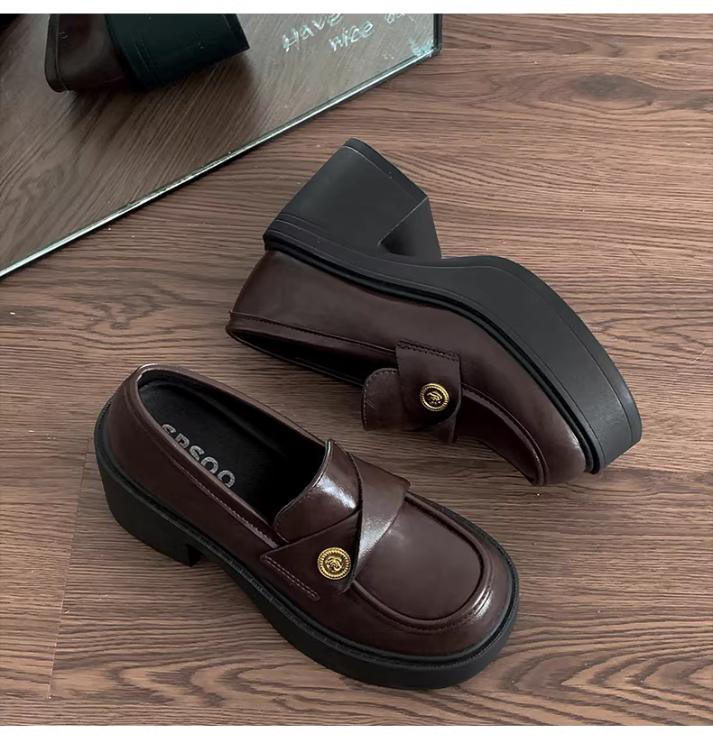 - Giày da đế thô kiểu Anh cổ điển màu đen đa năng dành cho nữ, mẫu mới mùa thu 2025, tăng chiều cao, kiểu lười dành cho người thấp.