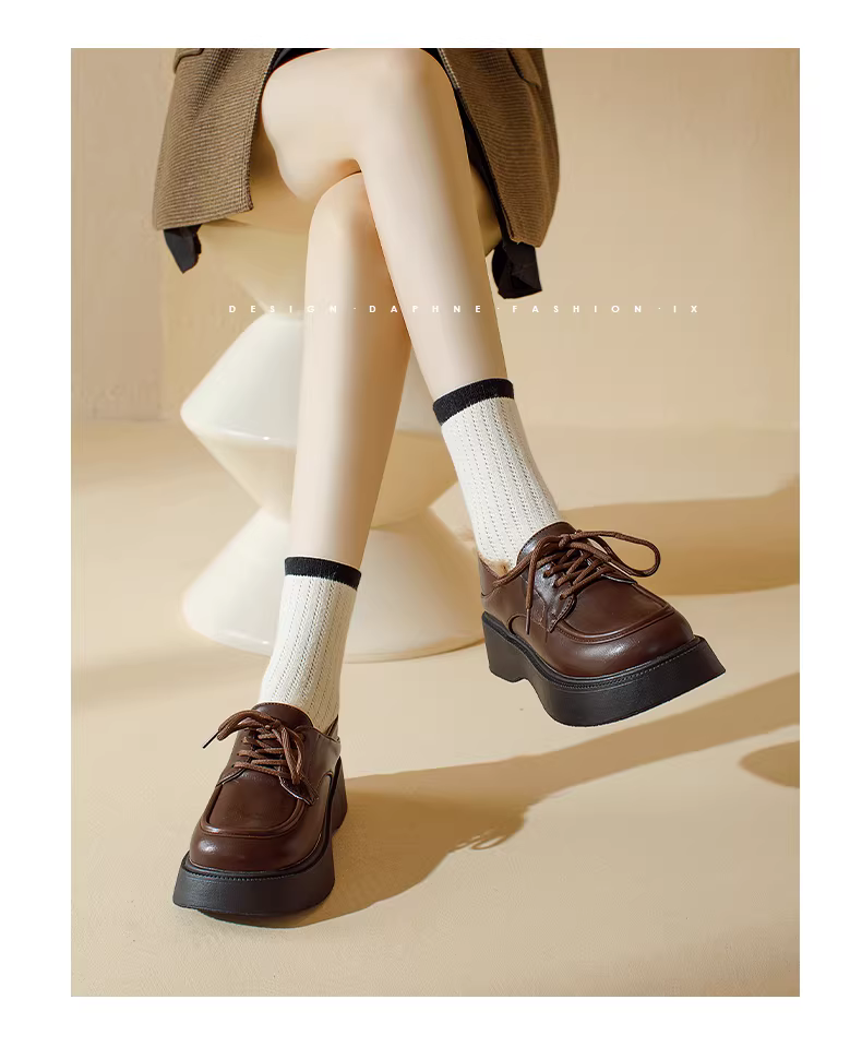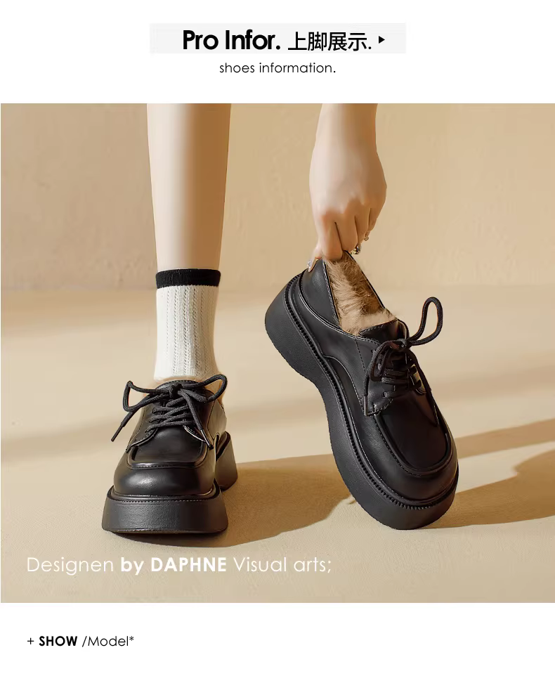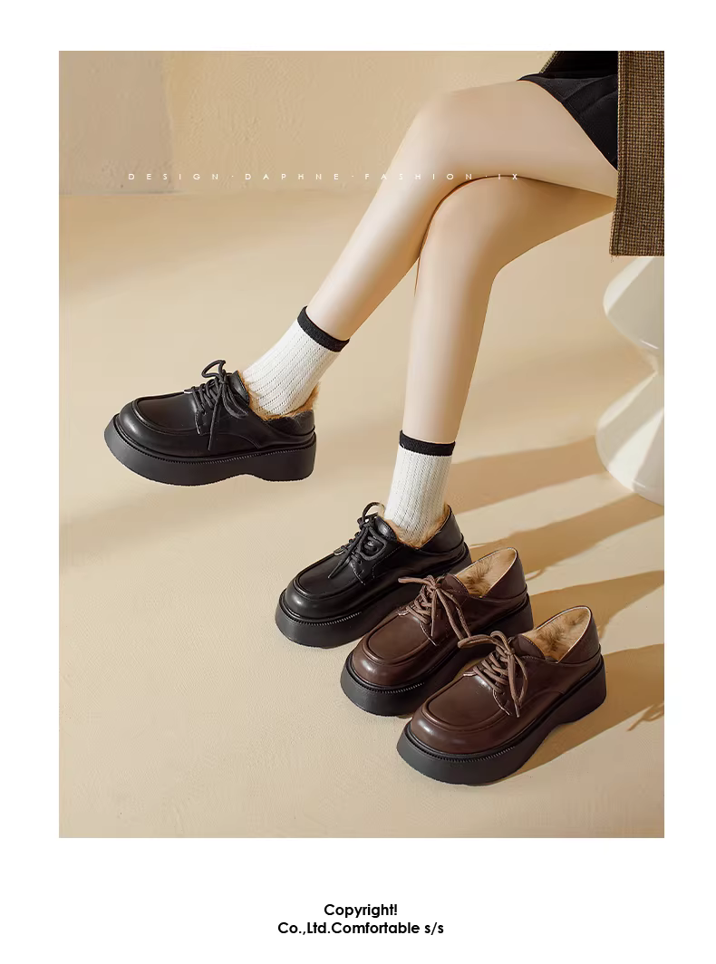 - Giày da lót lông Daphne dành cho nữ, mẫu mới thu đông 2025, kiểu Anh, ấm áp, buộc dây, màu nâu, chất liệu cotton.