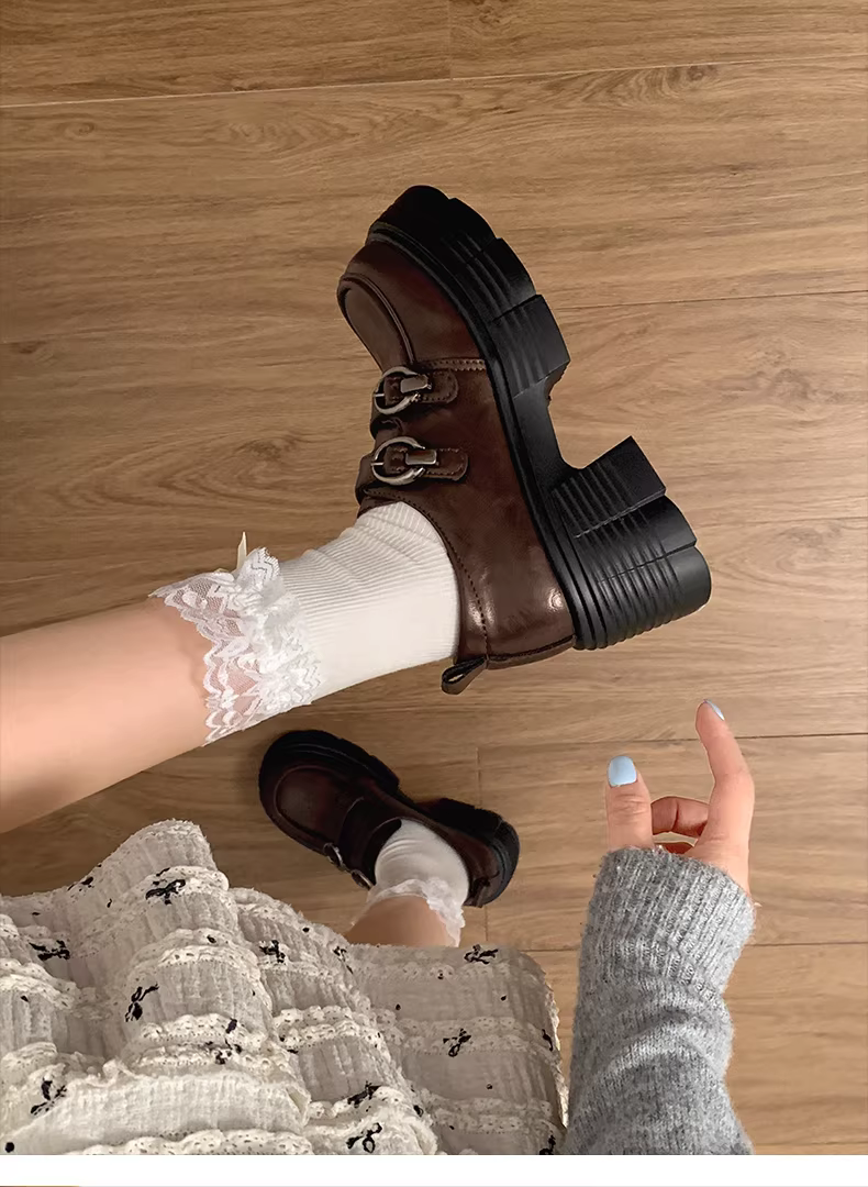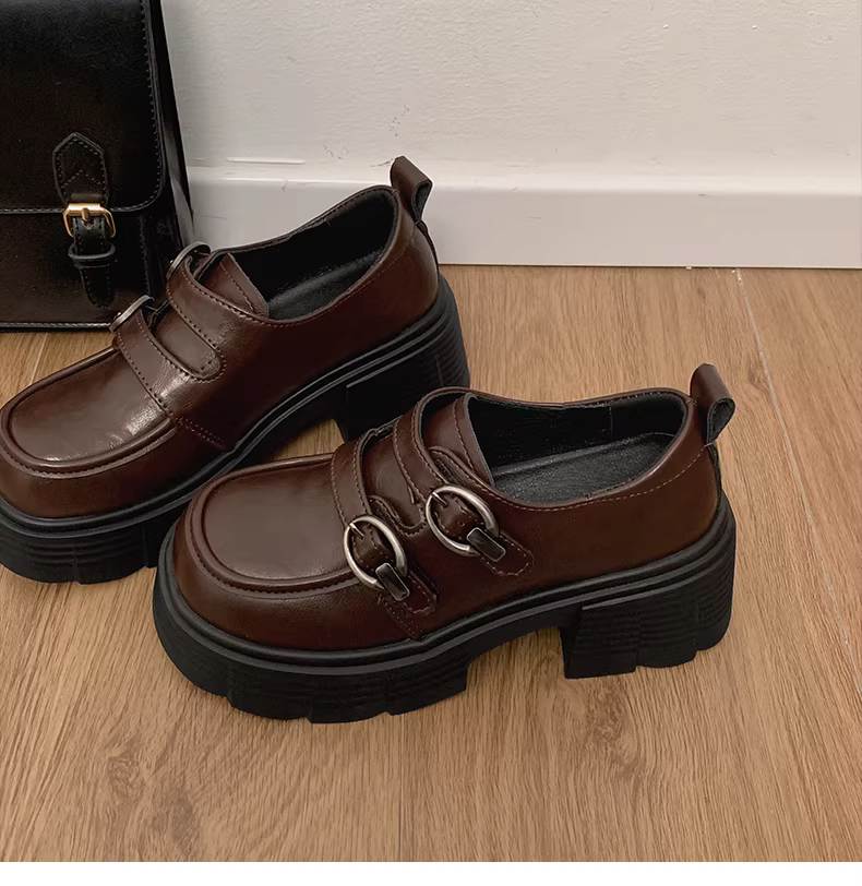 - Giày da nữ đế dày, gót vuông kiểu Anh, màu đen, phong cách mùa thu mới 2025, phối cùng chân váy, giày lười.