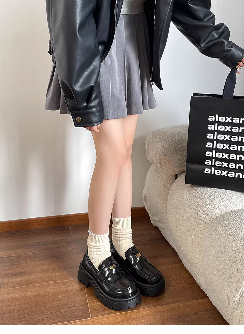- Giày da nữ đế dày kiểu Anh cổ điển màu đen, kiểu dáng mới mùa thu 2025, kiểu lười, gót chunky, phong cách Pháp