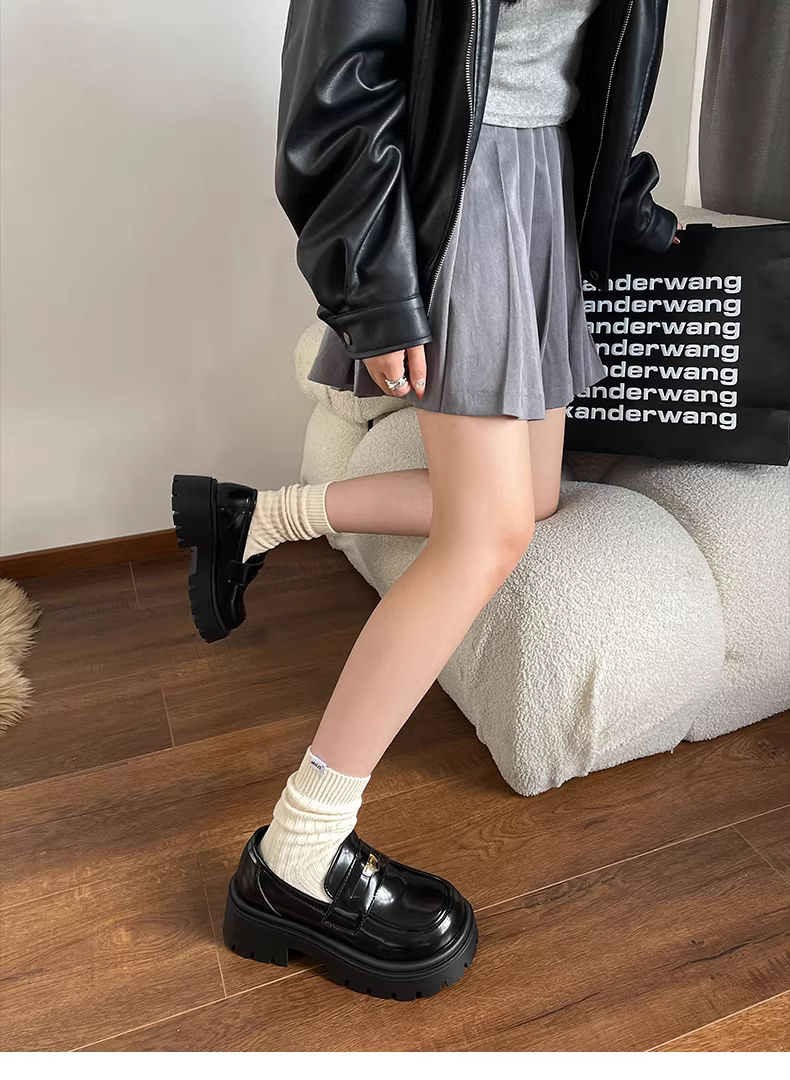 Giày da nữ đế dày kiểu Anh cổ điển màu đen, kiểu dáng mới mùa thu 2025, kiểu lười, gót chunky, phong cách Pháp