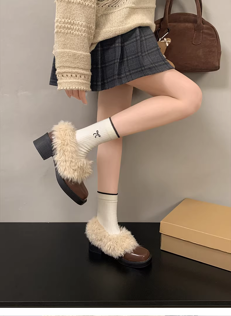 Giày da nữ đế dày kiểu Anh cổ điển màu đen, mùa thu đông 2025, lót lông giữ ấm, tăng chiều cao, gót cao