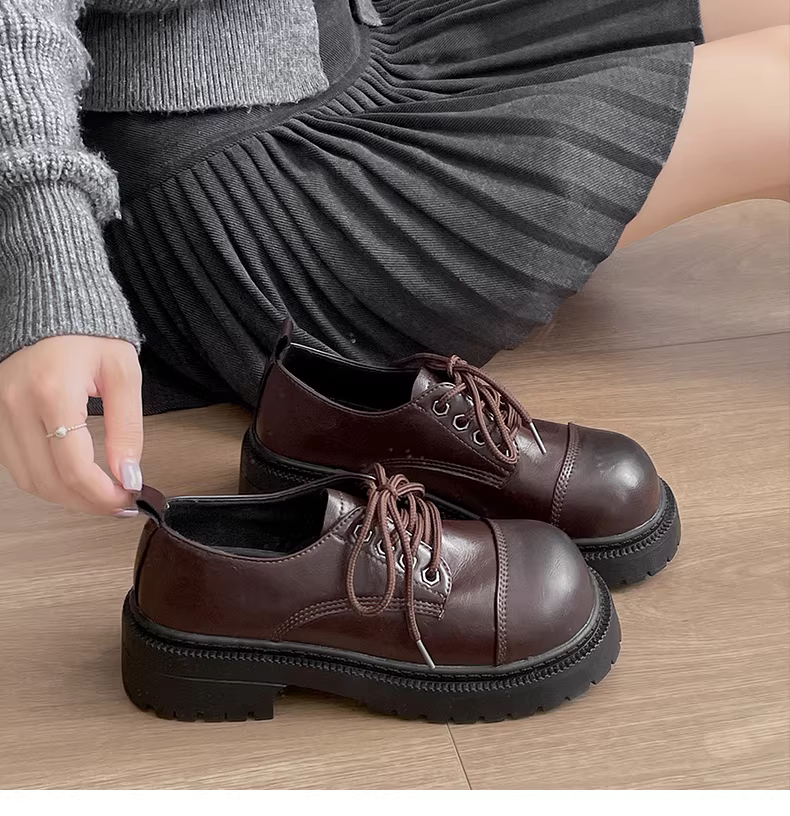 Giày da nữ đế dày kiểu Anh đen, đa năng, gót vuông, đế cao, kiểu Pháp, mùa thu mới 2025, tăng chiều cao